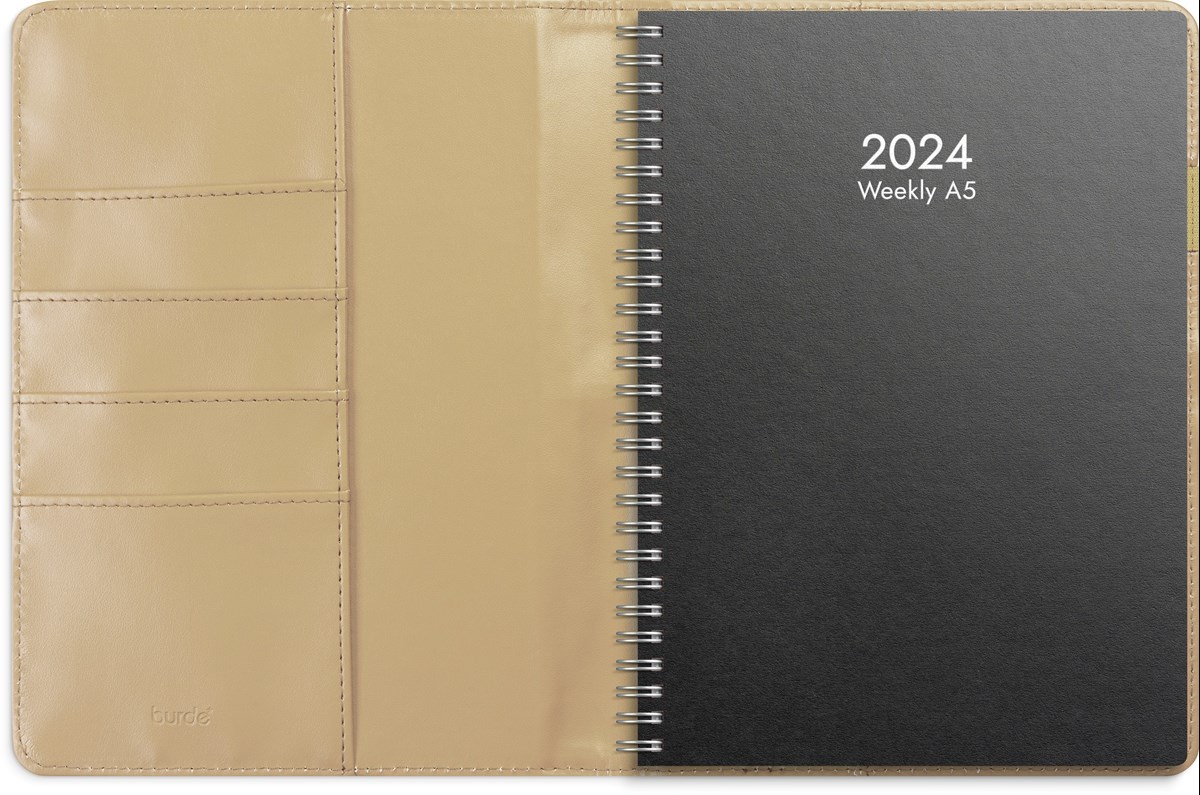 Kalender 2024 från Burde. Format: A5. Layout: Stående. Vecka/Uppslag. Timindelning 8-19. Kalendarium: 2023-12-11 - 2025-01-05. Omslag: Konstläder. Spiralbunden. Innehåll: Årsöversikter, årsplaner, årsöversikt på varje uppslag, internationella helgdagar. Antal sidor: 144. Miljöinformation: FSC papper.