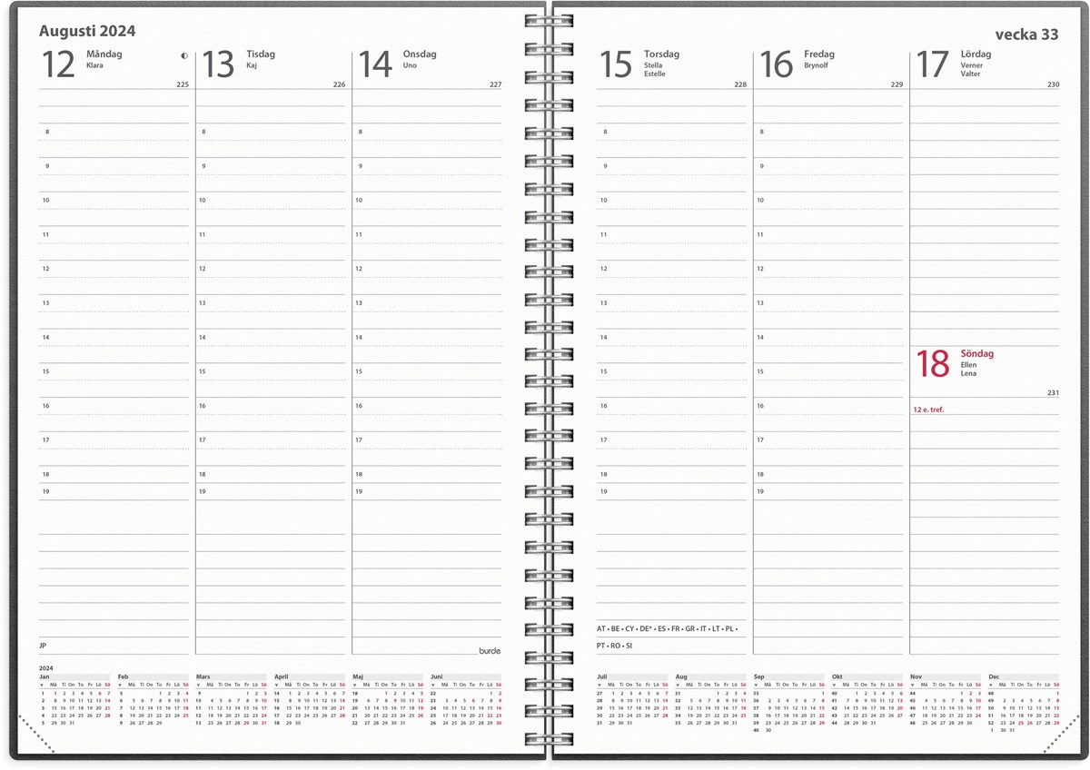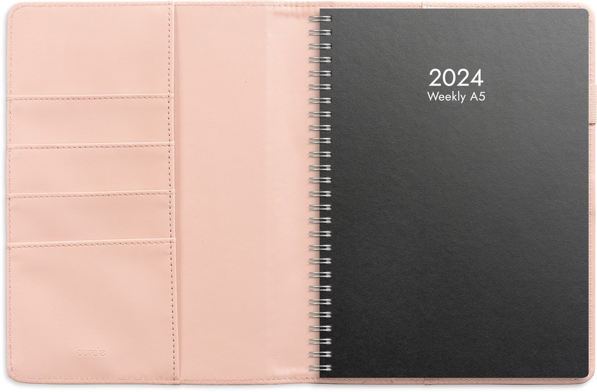Kalender 2024 från Burde. Format: A5. Layout: Stående. Vecka/Uppslag. Timindelning 8-19. Kalendarium: 2023-12-11 - 2025-01-05. Omslag: Konstläder. Spiralbunden. Innehåll: Årsöversikter, årsplaner, årsöversikt på varje uppslag, internationella helgdagar. Antal sidor: 144. Miljöinformation: FSC papper.