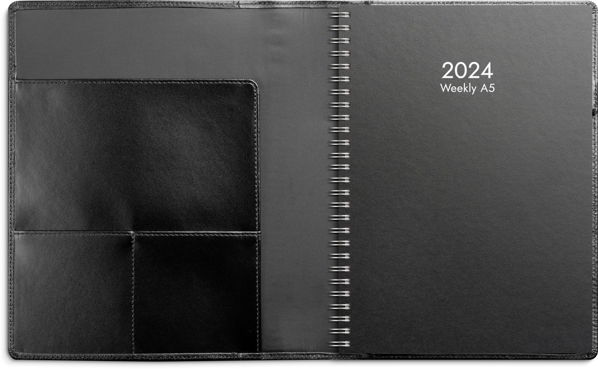 Kalender 2024 från Burde. Format: A5. Layout: Stående. Vecka/Uppslag. Timindelning 8-19. Kalendarium: 2023-12-11 - 2025-01-05. Omslag: Skinn. Spiralbunden. Innehåll: Årsöversikter, årsplaner, årsöversikt på varje uppslag, internationella helgdagar. Antal sidor: 144. Miljöinformation: FSC papper.