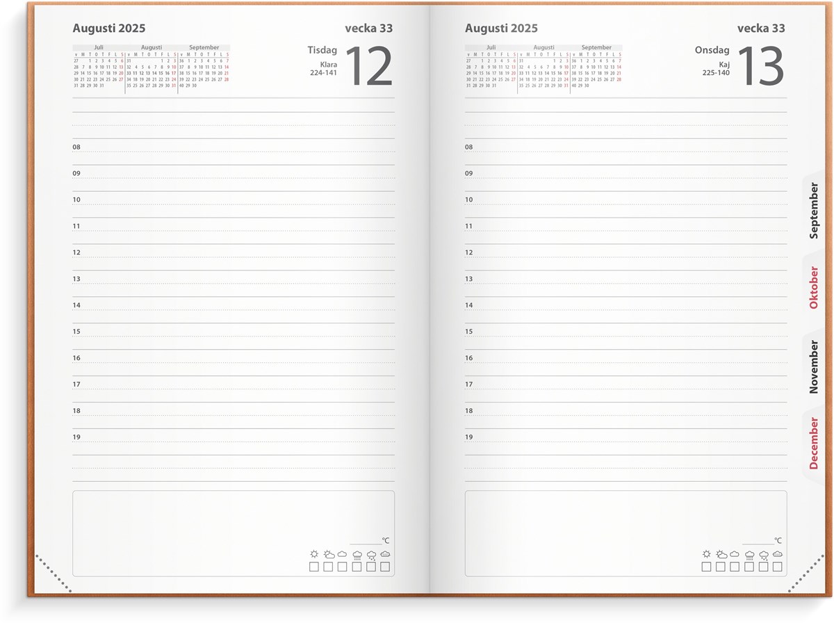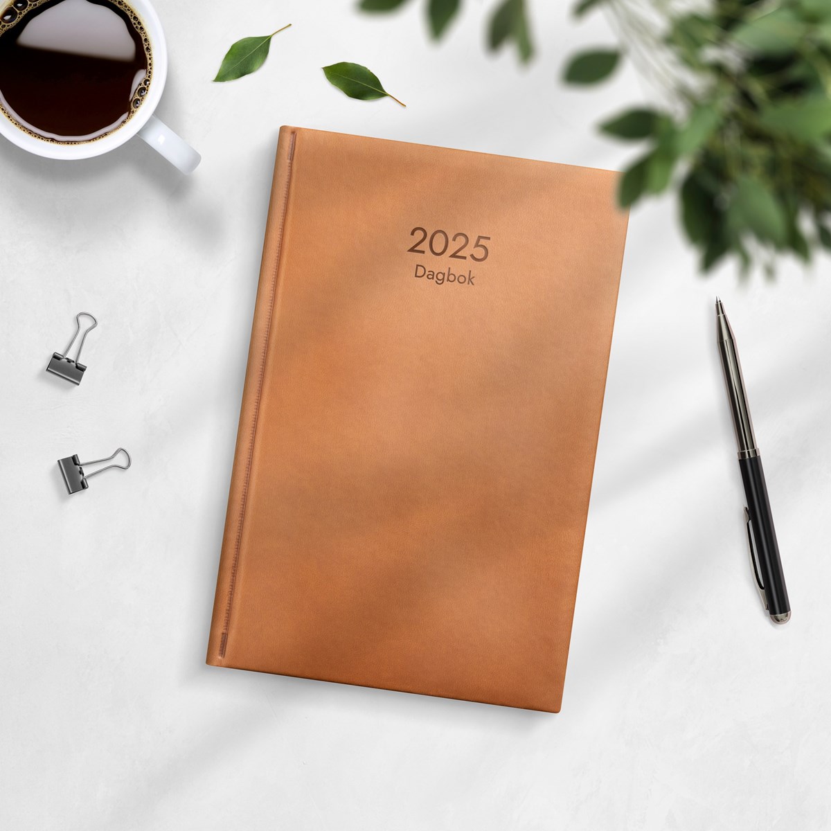 Kalender 2025 från Burde. Format: 135x205 mm. Layout: Dag/sida. Timindelning 8-19. Kalendarium: 2025-01-01 - 2025-12-31. Omslag: Konstläder. Inbunden. Detaljer: Märkband. Innehåll: Årsöversikter, årsplaner, urstansat månadsregister. Antal sidor: 400. Miljöinformation: FSC® papper.