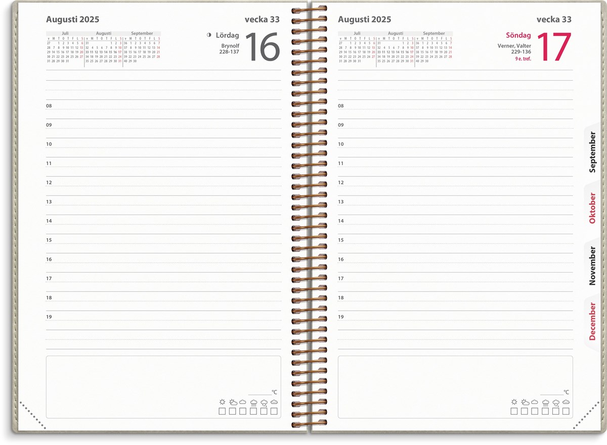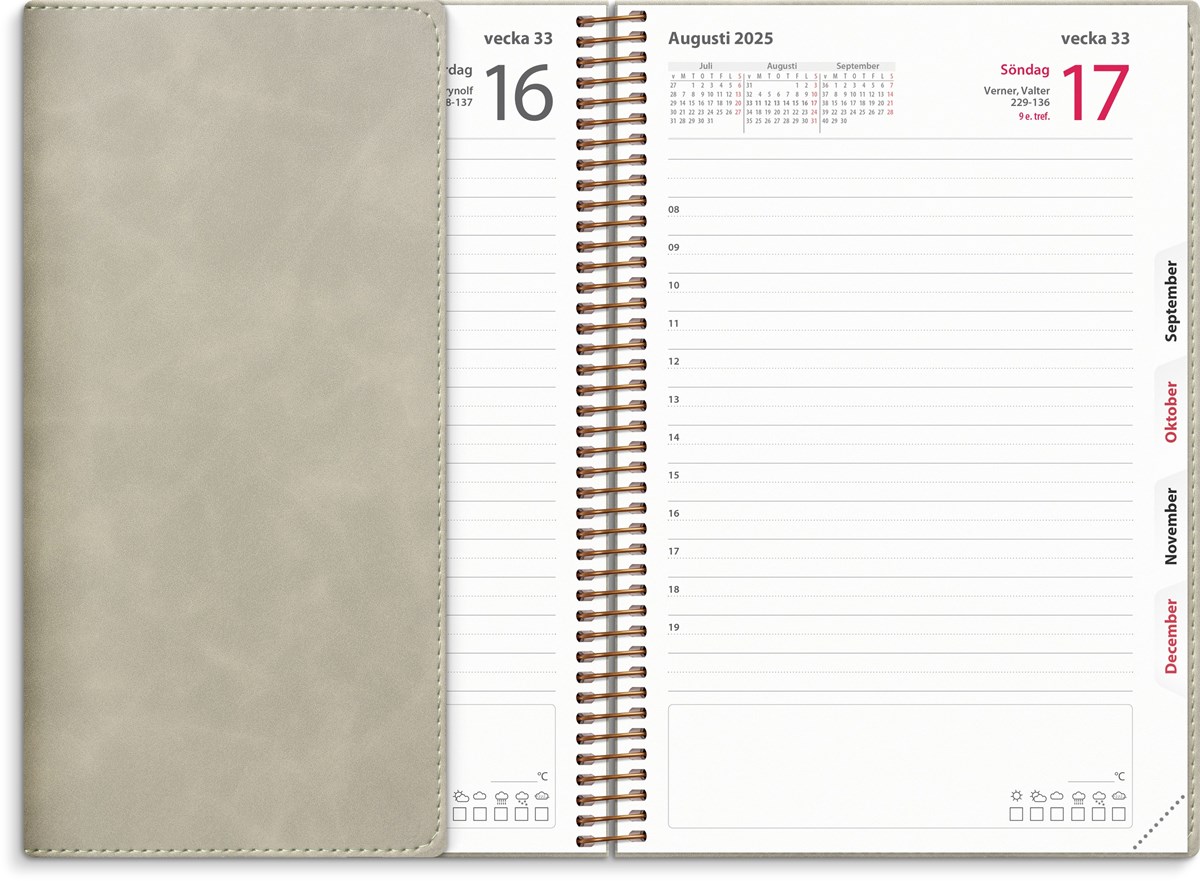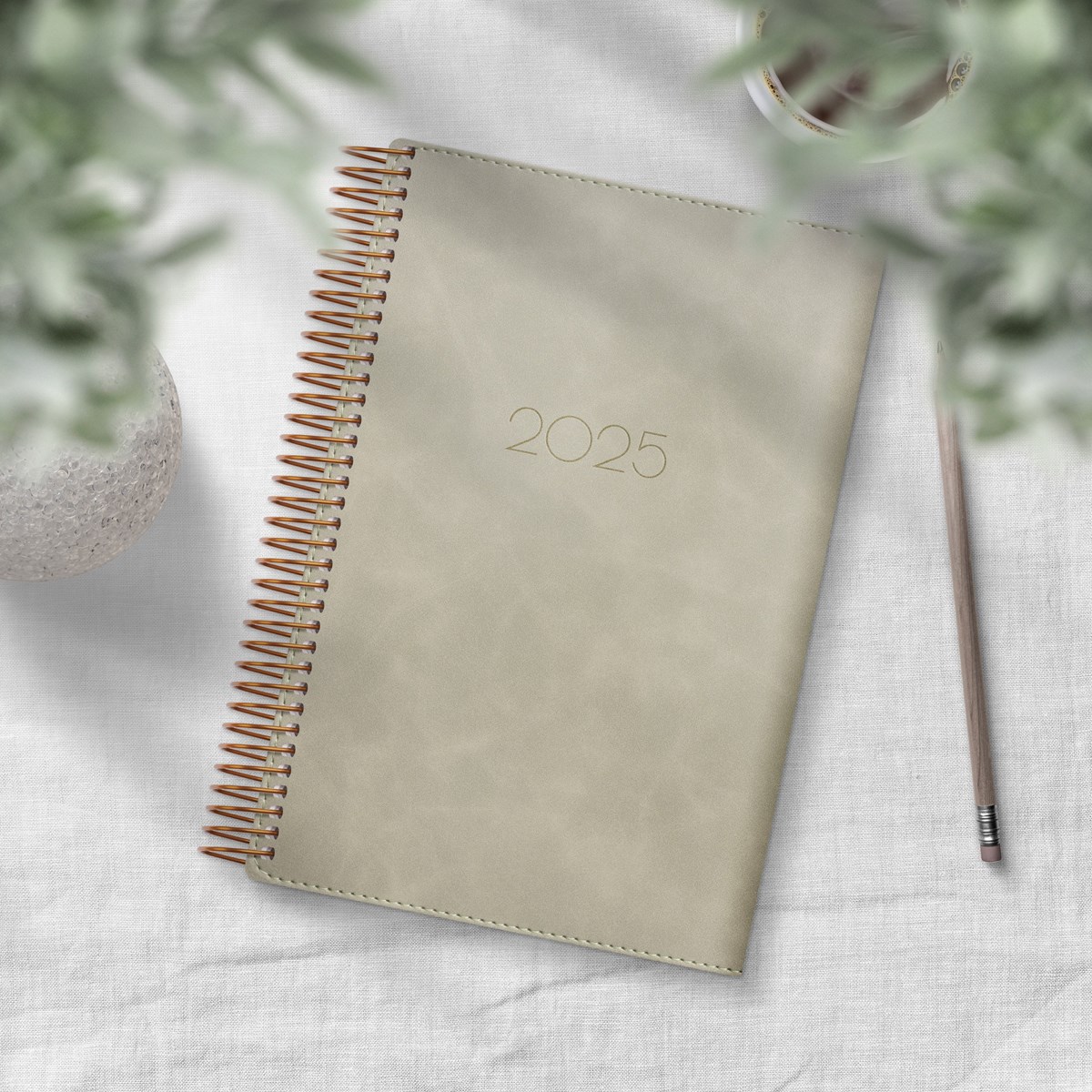 Kalender 2025 från Burde. Format: 135x205 mm. Layout: Dag/sida. Timindelning 8-19. Kalendarium: 2025-01-01 - 2025-12-31. Omslag: Konstläder. Spiralbunden. Innehåll: Årsplaner, urstansat månadsregister. Antal sidor: 152. Miljöinformation: FSC® papper.