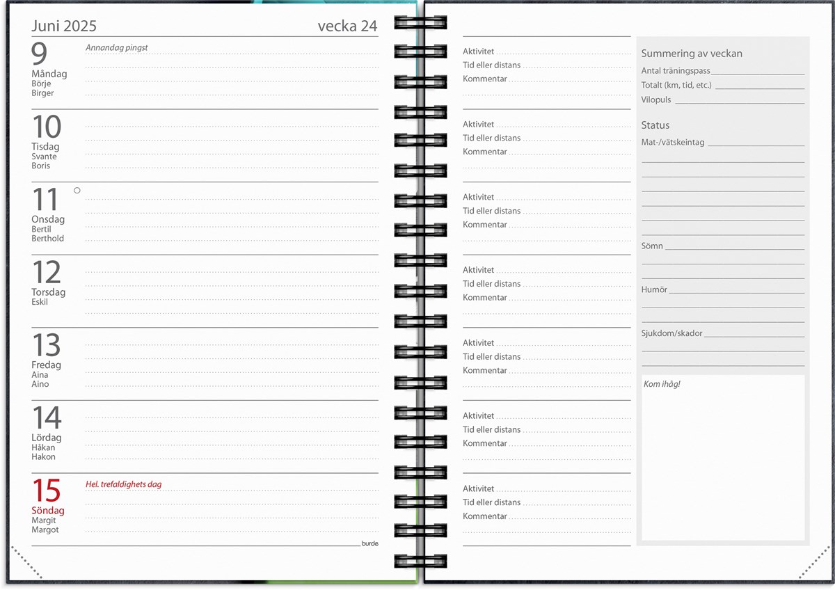 Kalender 2025 från Burde. Format: A6. Layout: Liggande. Vecka/uppslag. Kalendarium: 2024-12-23 - 2026-01-04. Omslag: Kartong med sammetslen yta. Spiralbunden. Detaljer: Gummiband. Innehåll: Årsplaner. Antal sidor: 160. Miljöinformation: FSC®.