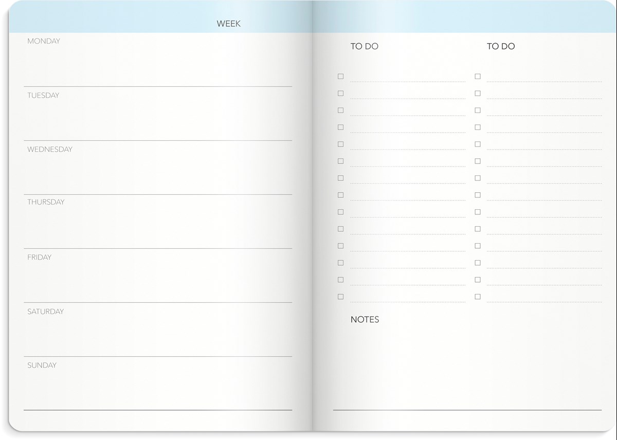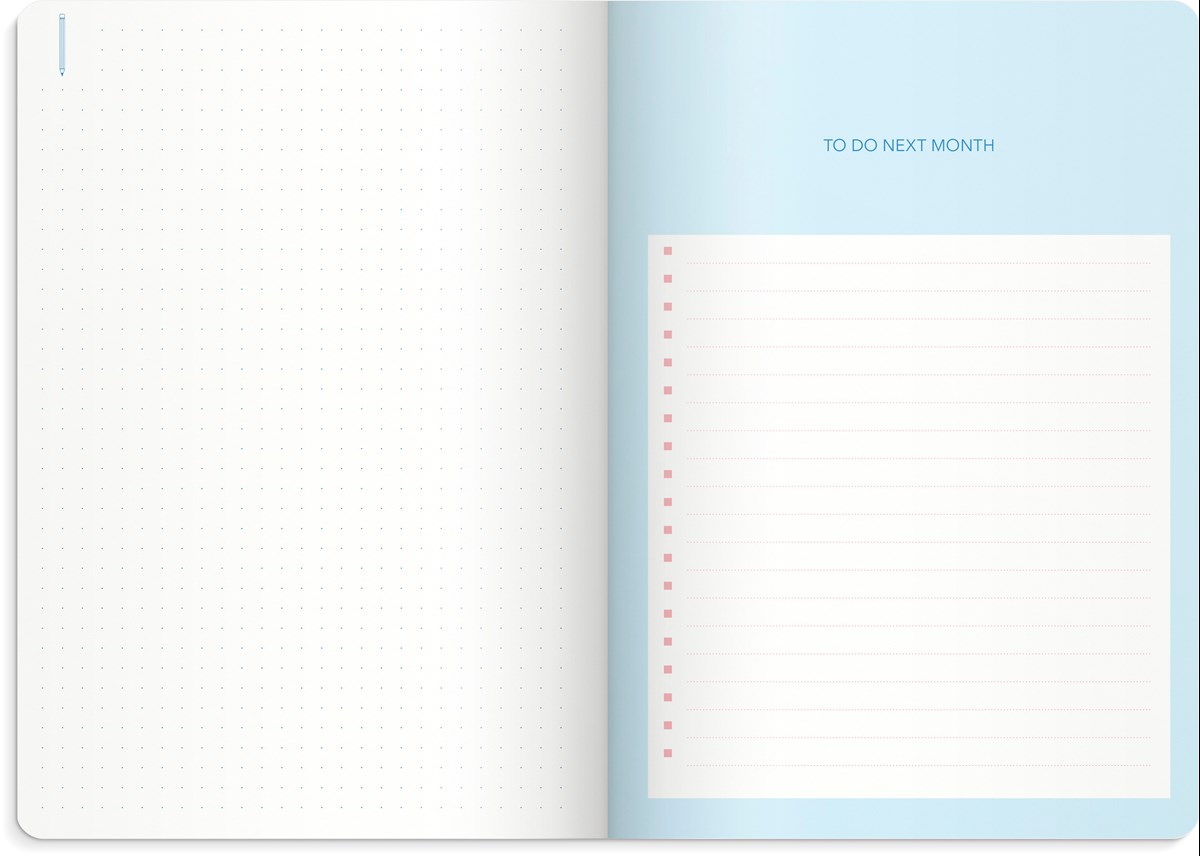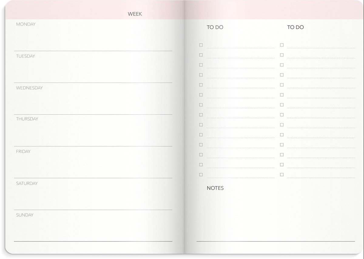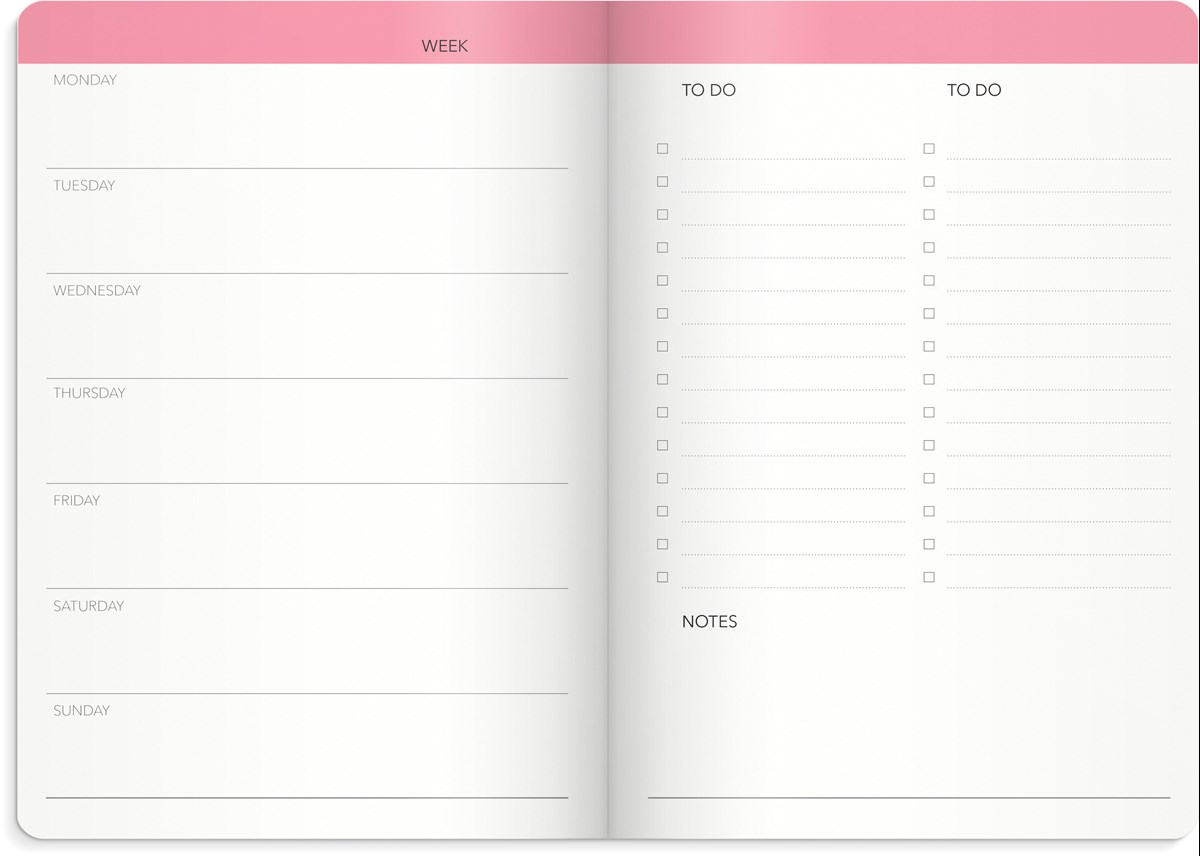 Inbunden, odaterad kalender i mjukt, mörkrosa kartongomslag med silverprägling med vitt märkband och pappersficka bak. Smart planeringsverktyg med att-göra-listor för varje månad, vecka och nästkommande månad, plats för dagliga anteckningar, samt prickade sidor för egna kreationer. Engelsk inlaga. 90 g vitt papper, 128 vita blad (256 sidor). Format: A5.