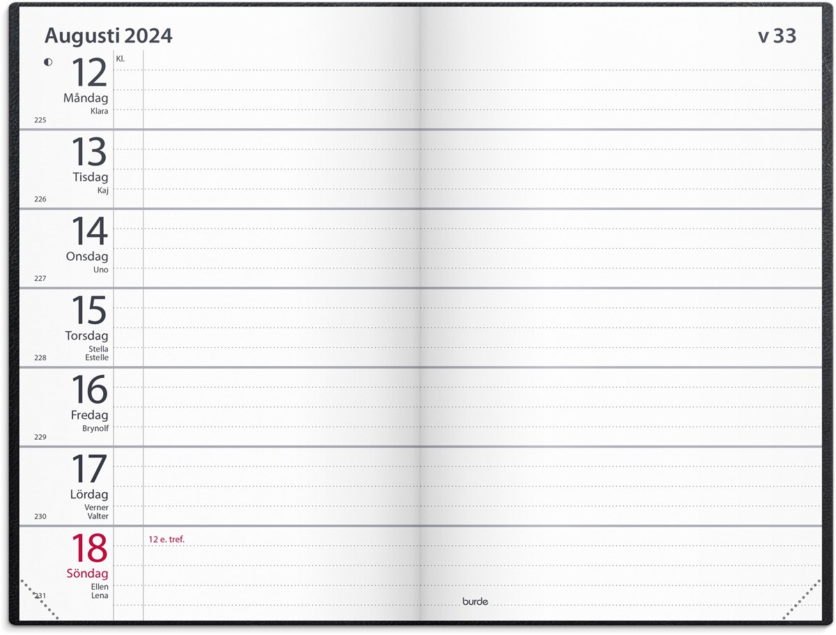 Kalender 2024 från Burde. Format: 82x127 mm. Layout: Liggande. Vecka/Uppslag. Kalendarium: 2023-12-18 - 2025-01-05. Omslag: Konstläder. Inbunden. Innehåll: Årsöversikter, årsplaner, löst telefonregister, atlas. Antal sidor: 168. Miljöinformation: FSC.