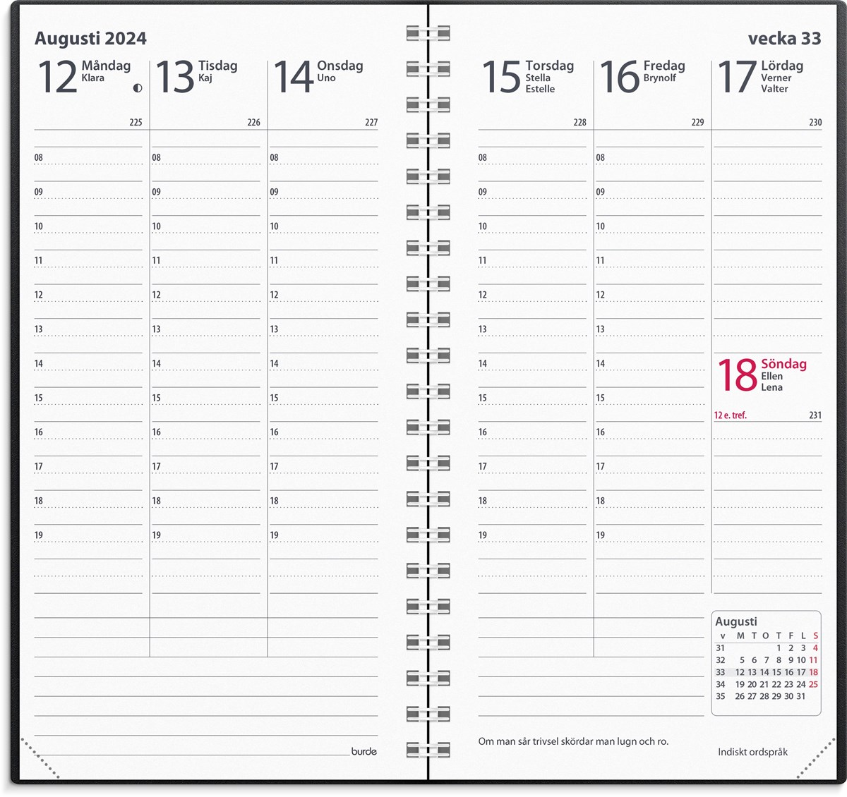 Kalender 2024 från Burde. Format: 83x158 mm. Layout: Stående. Vecka/Uppslag. Timindelning 8-19. Kalendarium: 2023-09-18 - 2025-03-23. Omslag: Plast. Spiralbunden. Innehåll: Årsöversikter, årsplaner, telefonregister. Antal sidor: 160. Miljöinformation: FSC.