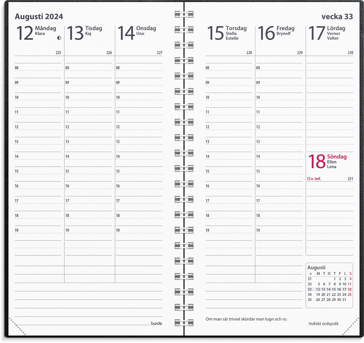 Kalender 2024 från Burde. Format: 83x158 mm. Layout: Stående. Vecka/Uppslag. Timindelning 8-19. Kalendarium: 2023-09-18 - 2025-03-23. Omslag: Skinn. Spiralbunden. Innehåll: Årsöversikter, årsplaner, telefonregister, atlas. Antal sidor: 160. Miljöinformation: FSC.
