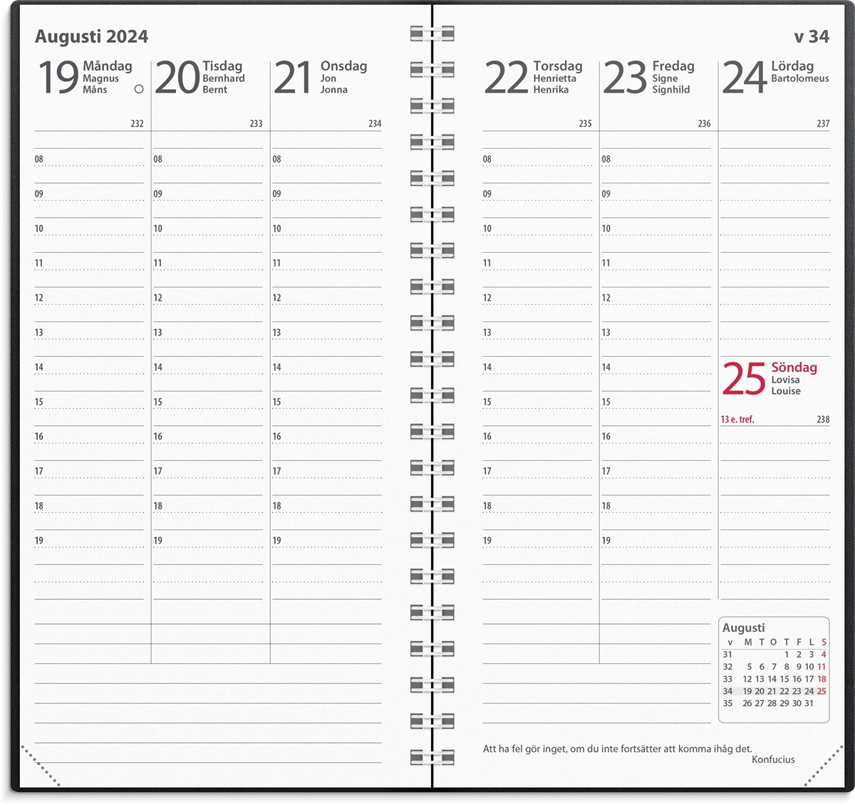 Kalender 2024 från Burde. Format: 83x158 mm. Layout: Stående. Vecka/Uppslag. Timindelning 8-19. Kalendarium: 2023-12-25 - 2025-01-05. Omslag: Plast. Spiralbunden. Innehåll: Årsöversikter, årsplaner, telefonregister. Antal sidor: 128. Miljöinformation: FSC.
