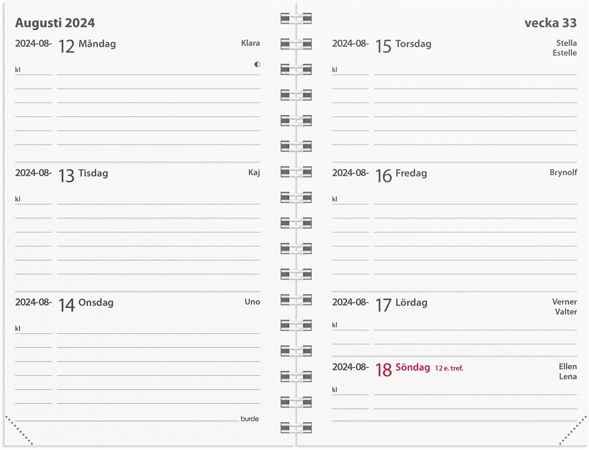 Kalender 2024 från Burde. Format: 83x127 mm. Layout: Liggande. Vecka/Uppslag. Kalendarium: 2023-12-18 - 2025-01-05. Omslag: Kartong. Spiralbunden. Innehåll: Årsöversikter, årsplaner, atlas. Antal sidor: 152. Miljöinformation: FSC.