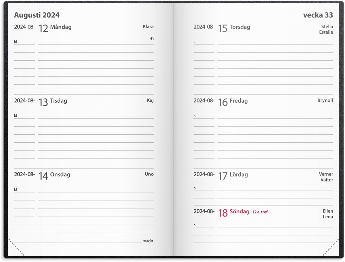Kalender 2024 från Burde. Format: 83x127 mm. Layout: Liggande. Vecka/Uppslag. Kalendarium: 2023-12-18 - 2025-01-05. Omslag: Konstläder. Inbunden. Innehåll: Årsöversikter, årsplan, telefonregister, atlas. Antal sidor: 168. Miljöinformation: FSC.