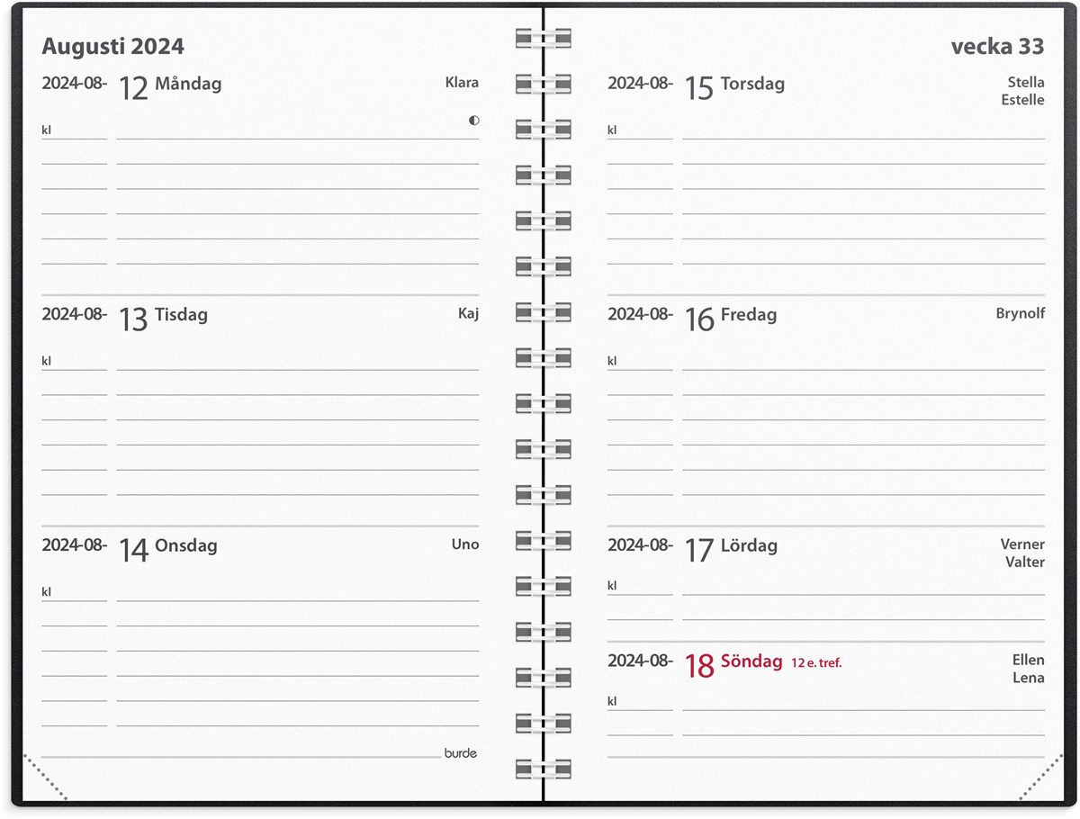 Kalender 2024 från Burde. Format: 83x127 mm. Layout: Liggande. Vecka/Uppslag. Kalendarium: 2023-12-18 - 2025-01-05. Omslag: Plast. Spiralbunden. Innehåll: Årsöversikter, årsplaner, telefonregister. Antal sidor: 128. Miljöinformation: FSC.