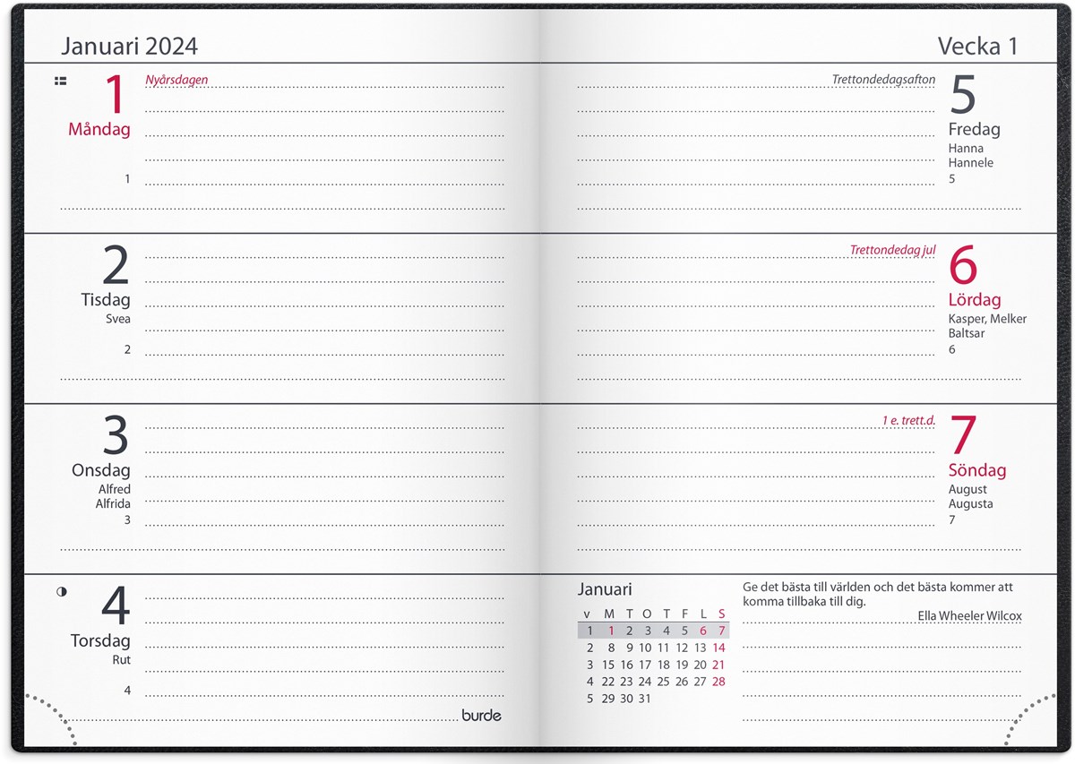 Kalender 2024 från Burde. Format: 70x100 mm. Layout: Liggande. Vecka/Uppslag. Kalendarium: 2023-12-25 - 2025-01-05. Omslag: Konstläder. Inbunden. Innehåll: Årsöversikt, årsplan, telefonregister, atlas. Antal sidor: 192. Miljöinformation: FSC.