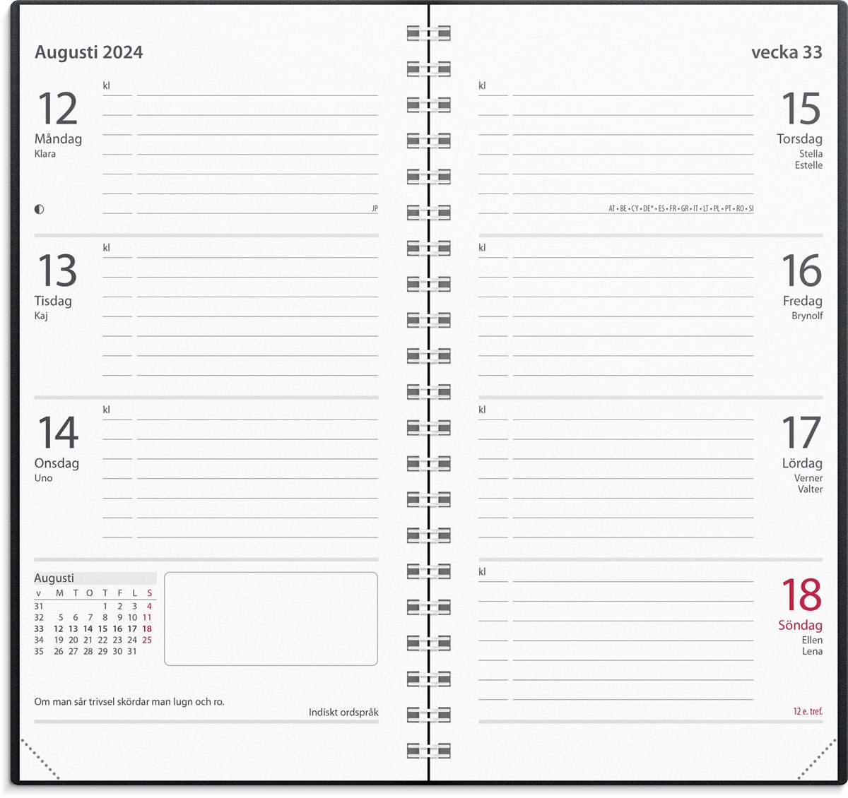 Kalender 2024 från Burde. Format: 83x158 mm. Layout: Liggande. Vecka/Uppslag. Kalendarium: 2023-12-11 - 2025-01-05. Omslag: Plast. Spiralbunden. Innehåll: Årsöversikter, årsplaner, telefonregister, viktiga datum för religiösa högtider inom islam och judendom. Antal sidor: 128. Miljöinformation: FSC.