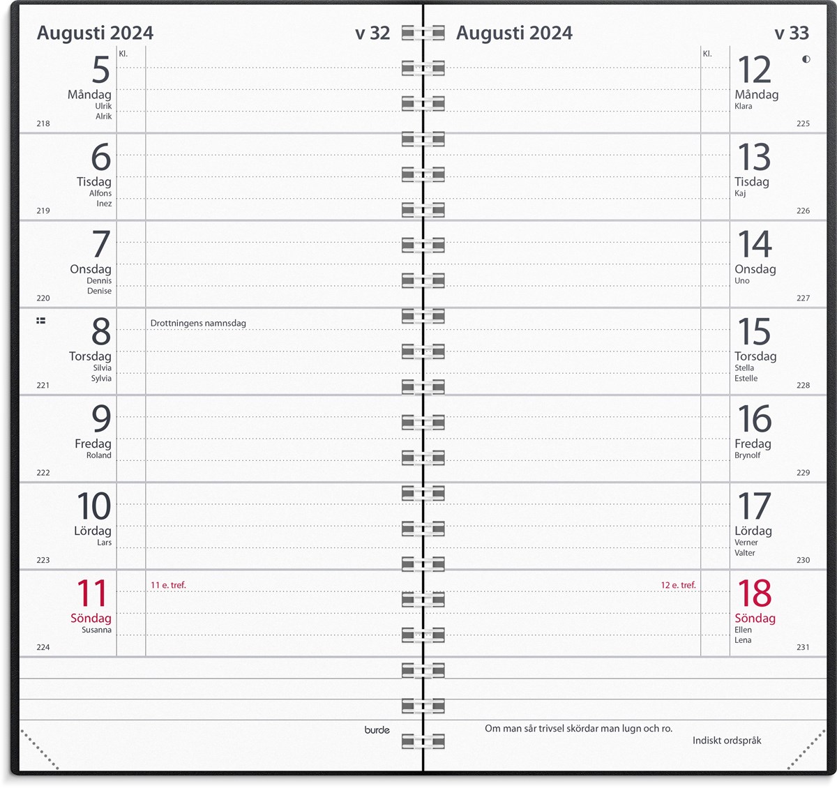 Kalender 2024 från Burde. Format: 85x158 mm. Layout: Liggande. Två Veckor/Uppslag. Kalendarium: 2023-12-25 - 2025-01-06. Omslag: Plast. Häftad. Innehåll: Årsöversikter, årsplaner, telefonregister. Antal sidor: 64. Miljöinformation: FSC.