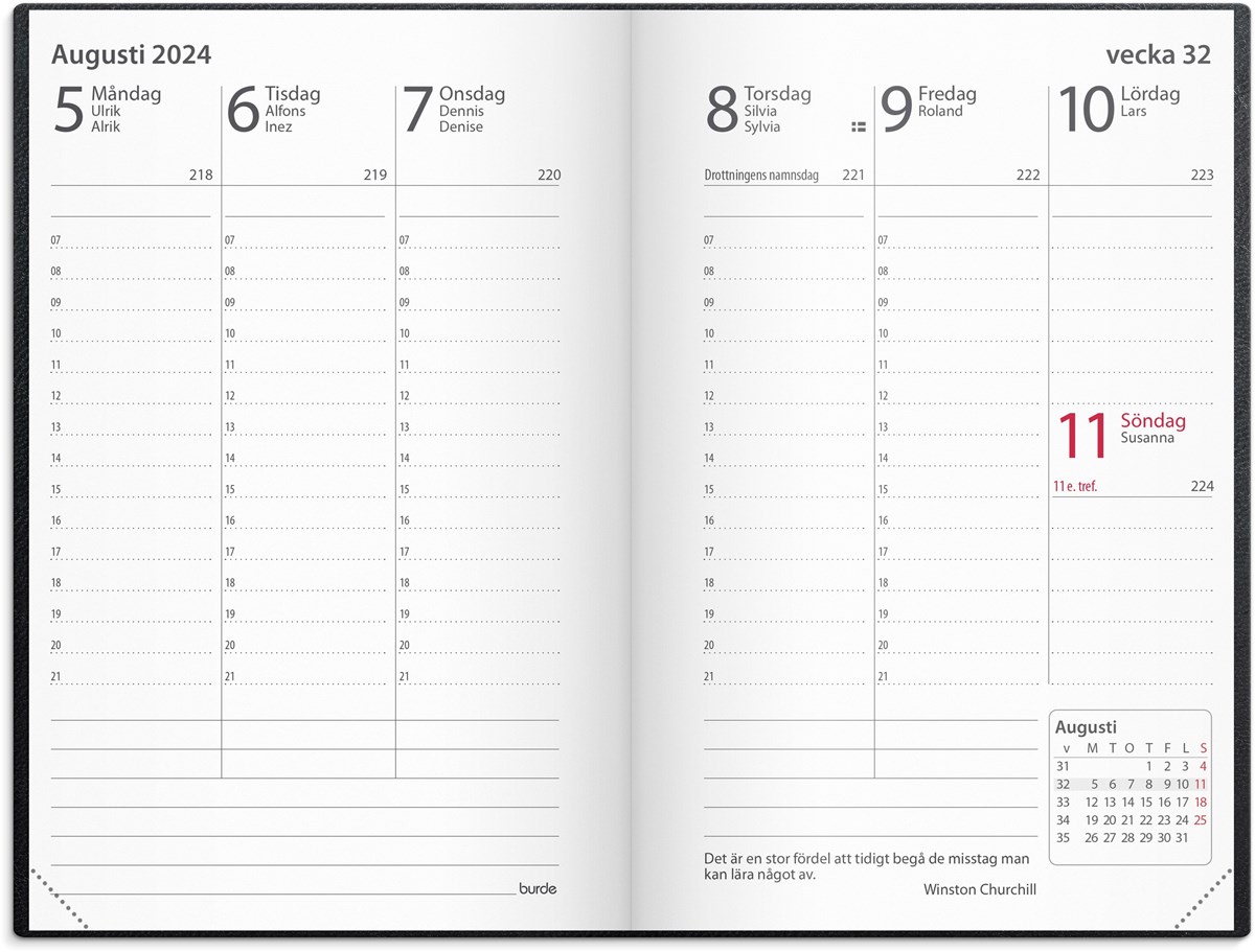 Kalender 2024 från Burde. Format: 83x127 mm. Layout: Stående. Vecka/Uppslag. Timindelning 7-21. Kalendarium: 2023-12-11 - 2025-01-05. Omslag: Konstläder. Inbunden. Innehåll: Årsöversikter, årsplaner, telefonregister, atlas. Antal sidor: 184. Miljöinformation: FSC.