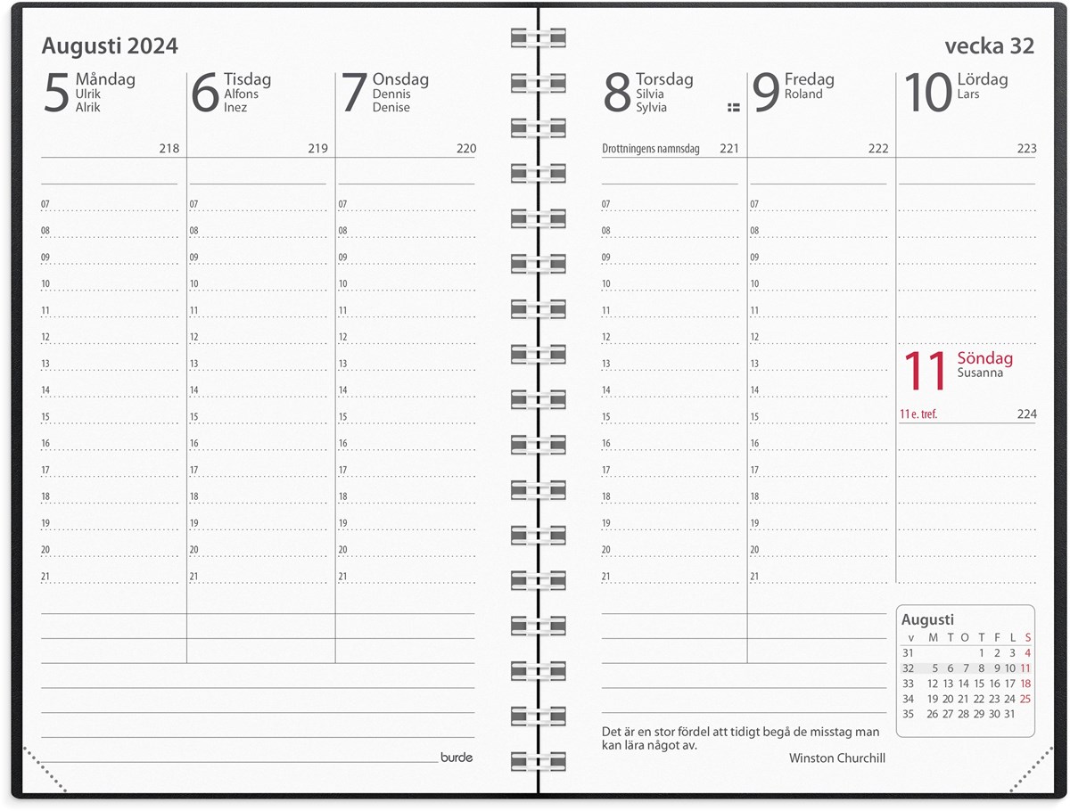Kalender 2024 från Burde. Format: 83x127 mm. Layout: Stående. Vecka/Uppslag. Timindelning 7-21. Kalendarium: 2023-12-11 - 2025-01-05. Omslag: Plast. Spiralbunden. Innehåll: Årsöversikter, årsplaner, telefonregister. Antal sidor: 128. Miljöinformation: FSC.
