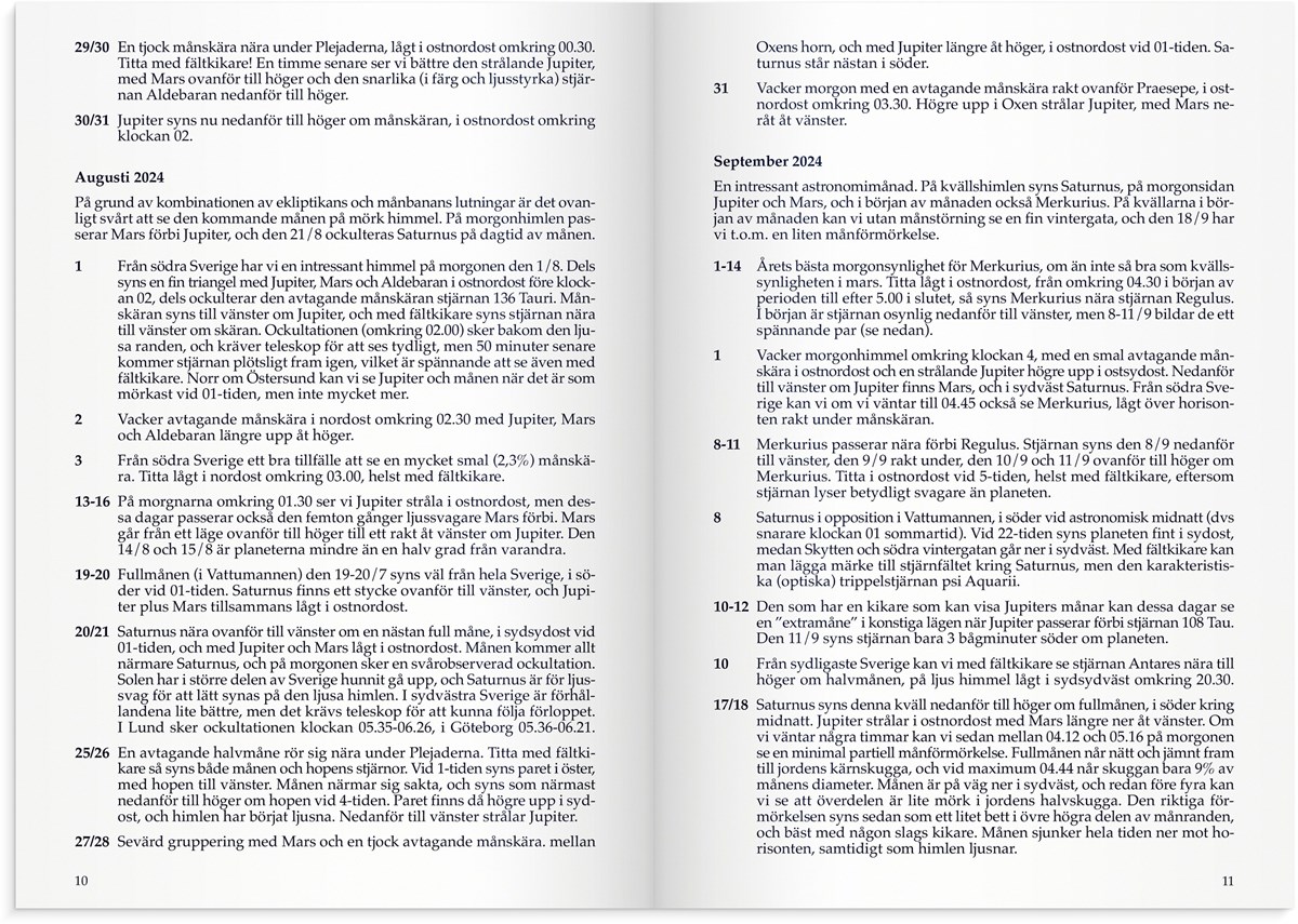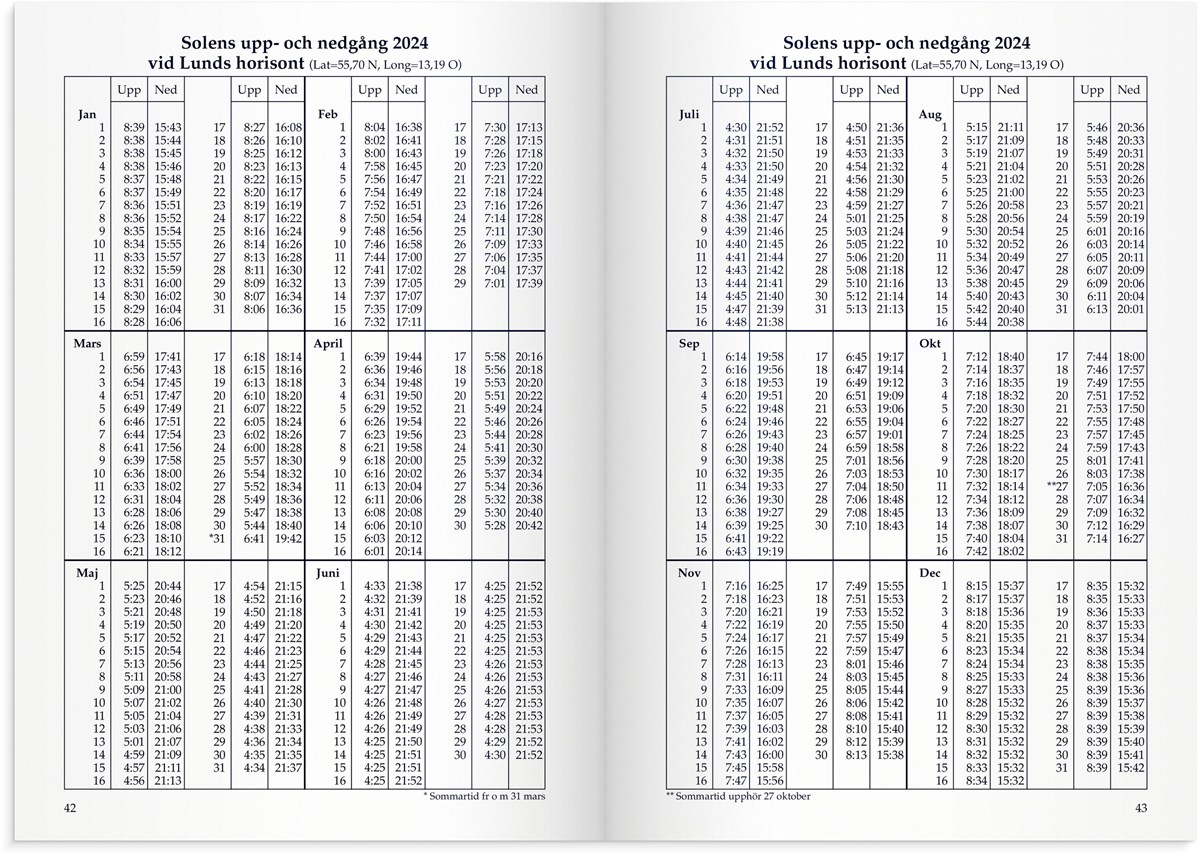 Kalender där du kan följa solens och månens upp- och nedgång varje dag vid sex olika horisonter. Den innehåller fakta om planeterna på himlen för varje månad och blandade uppgifter om Sverige.