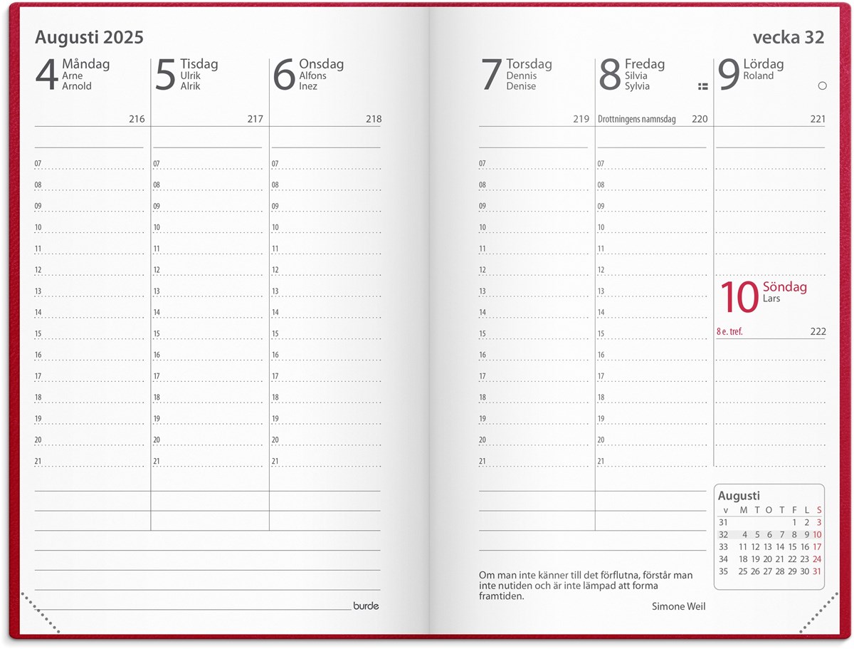 Kalender 2025 från Burde. Format: 83x127 mm. Layout: Stående. Vecka/uppslag. Timindelning 7-21. Kalendarium: 2024-12-09 - 2026-01-04. Omslag: Konstläder. Inbunden. Innehåll: Årsöversikter, årsplaner, telefonregister, atlas. Antal sidor: 152. Miljöinformation: FSC® papper.