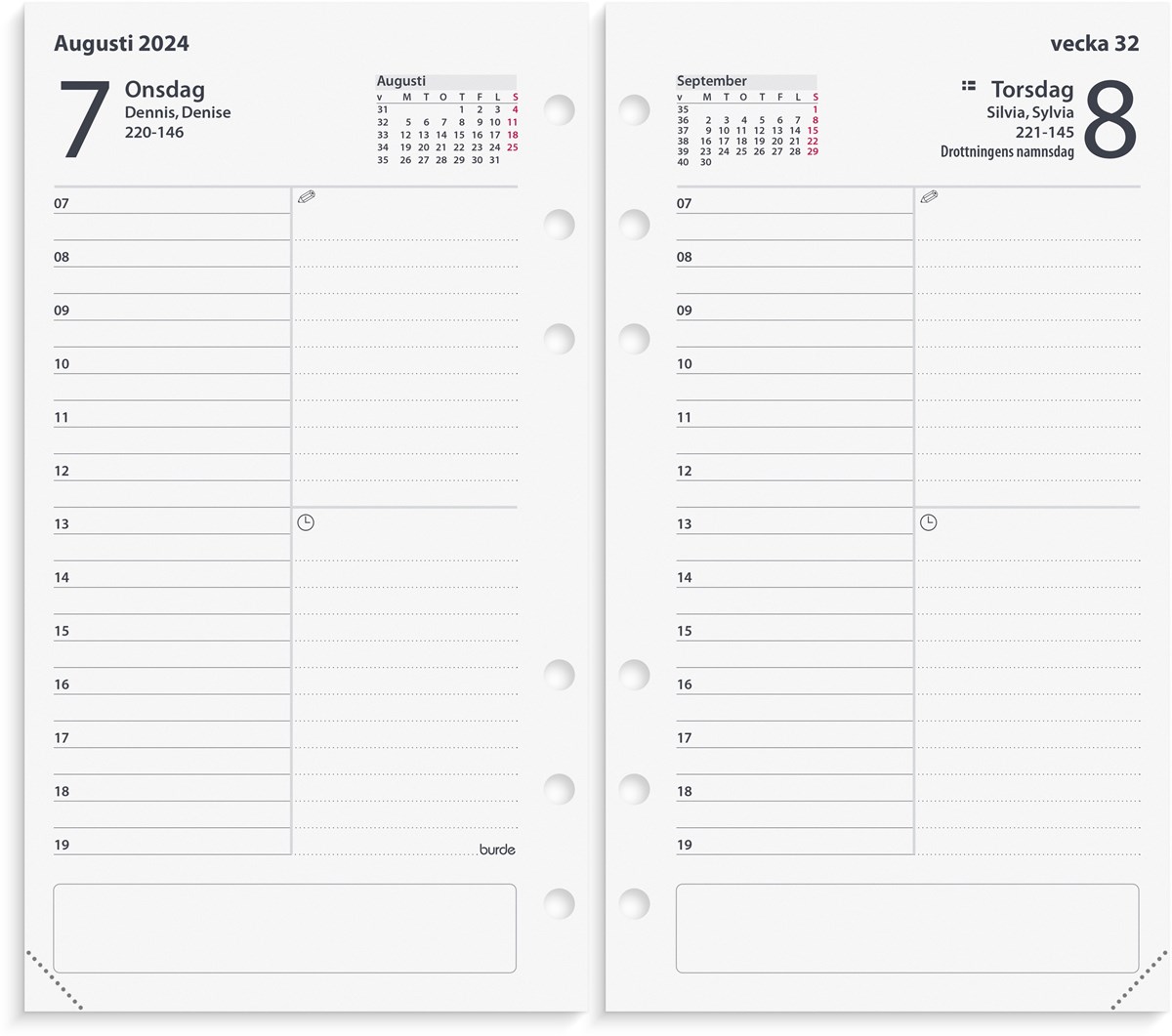 Hålad kalenderrefill till systemkalender med ringmekanism.