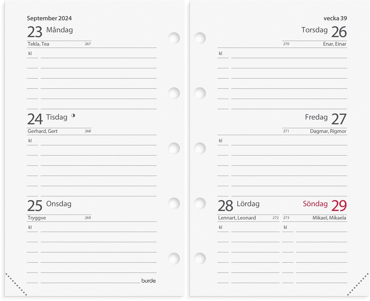 Kalender 2024 från Burde. Format: 63x107 mm. Layout: Liggande. Vecka/Uppslag. Kalendarium: 2023-11-13 - 2025-01-05. Omslag: Skinn. Innehåll: Årsöversikt. Antal sidor: 160. Miljöinformation: FSC® papper.