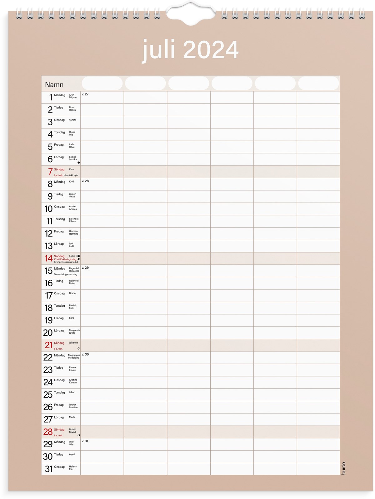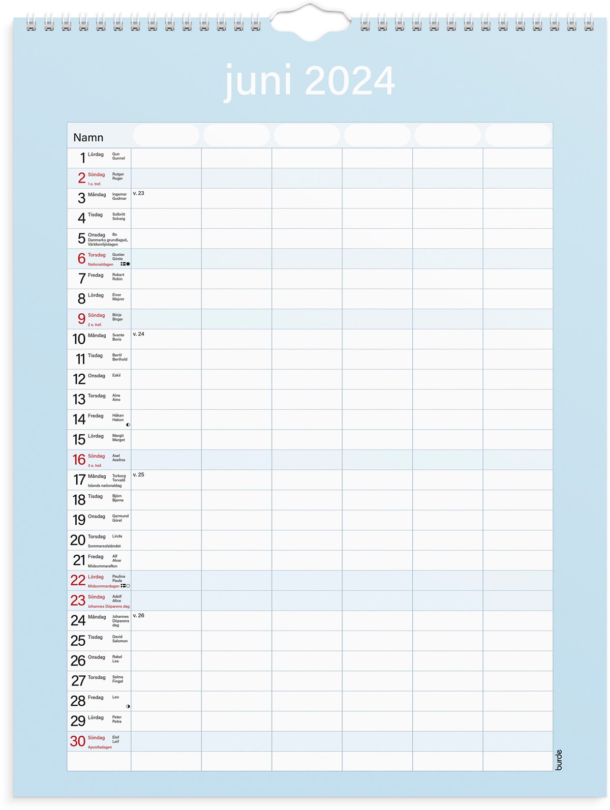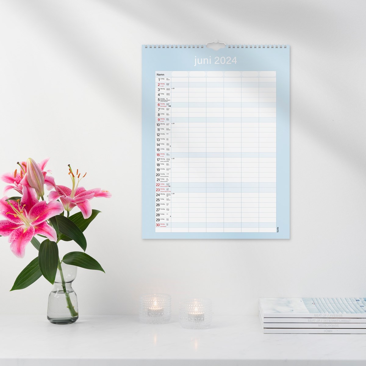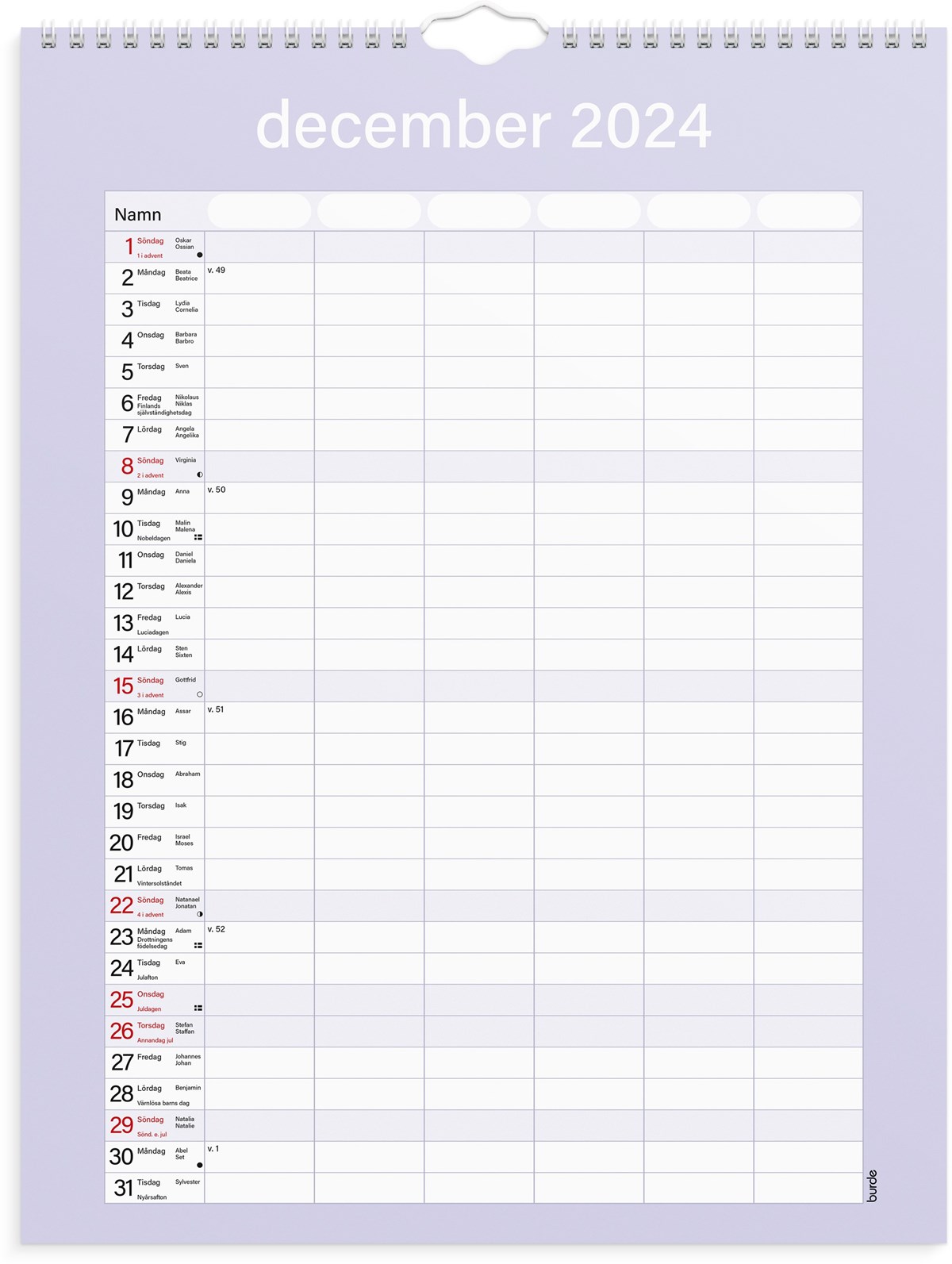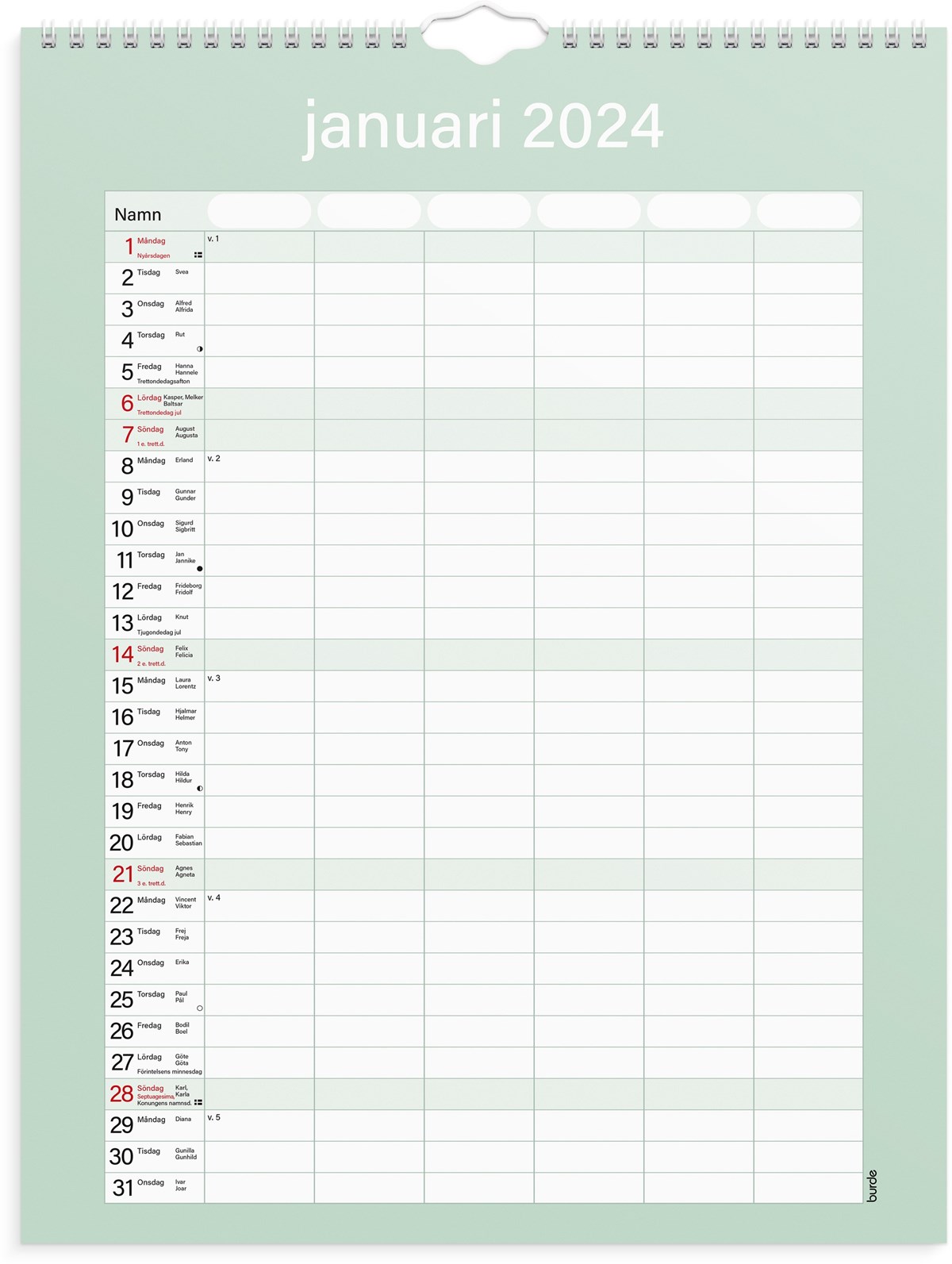 Familjekalender 2024 från Burde. Format: 295x390 mm. Layout: Månad/Blad. Kalendarium: 2024-01-01 - 2024-12-31. Spiralbunden. Innehåll: Sex kolumner. Antal sidor: 12. Miljöinformation: FSC.