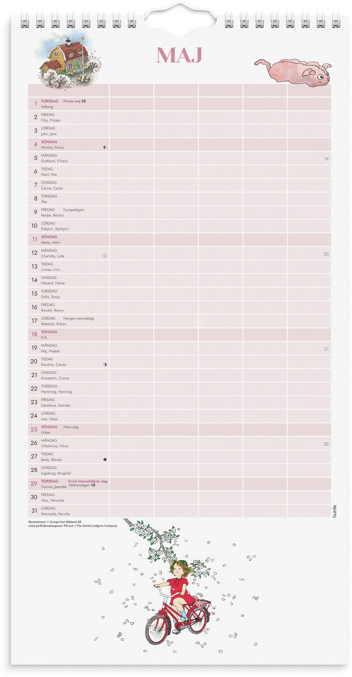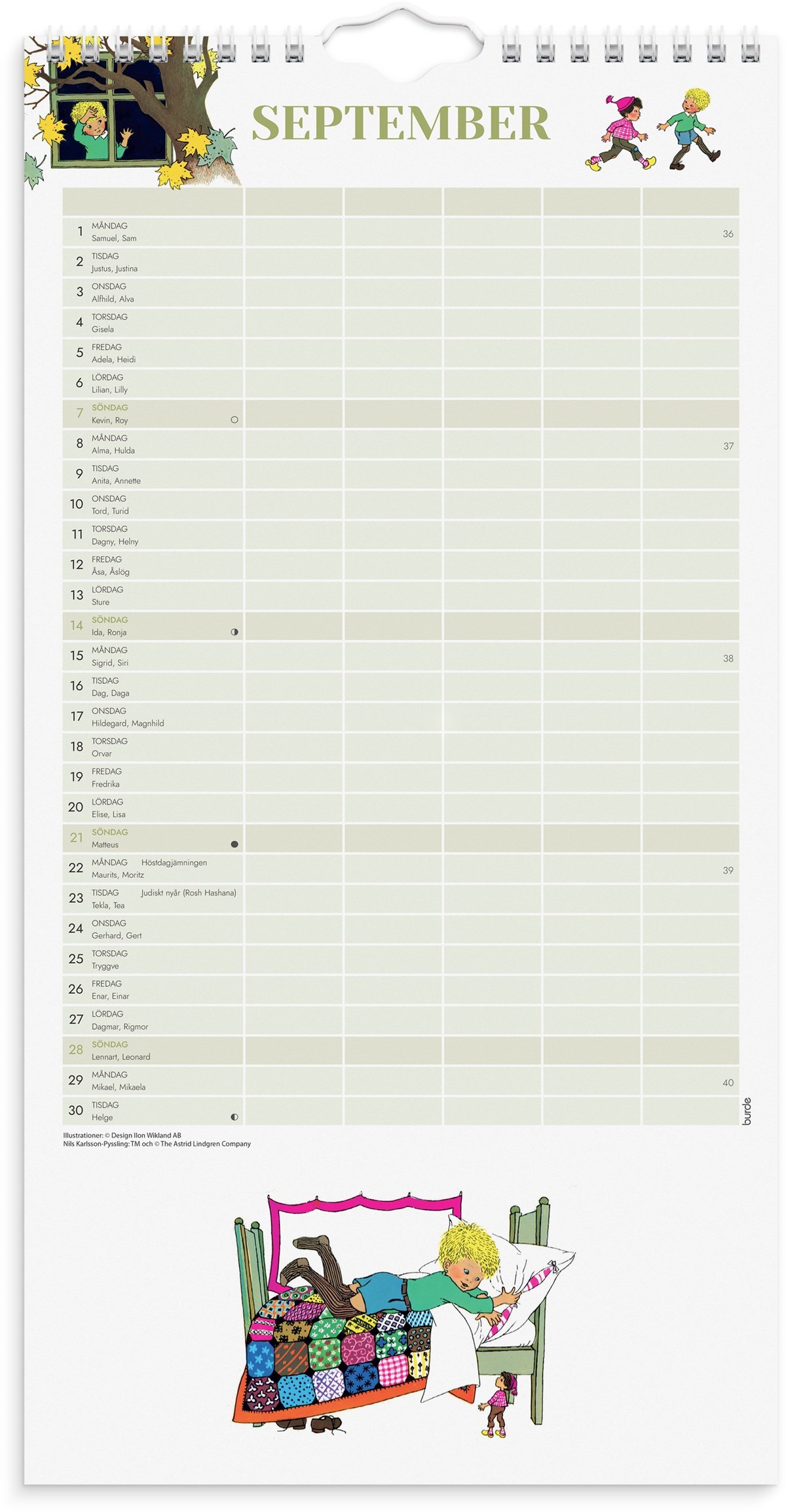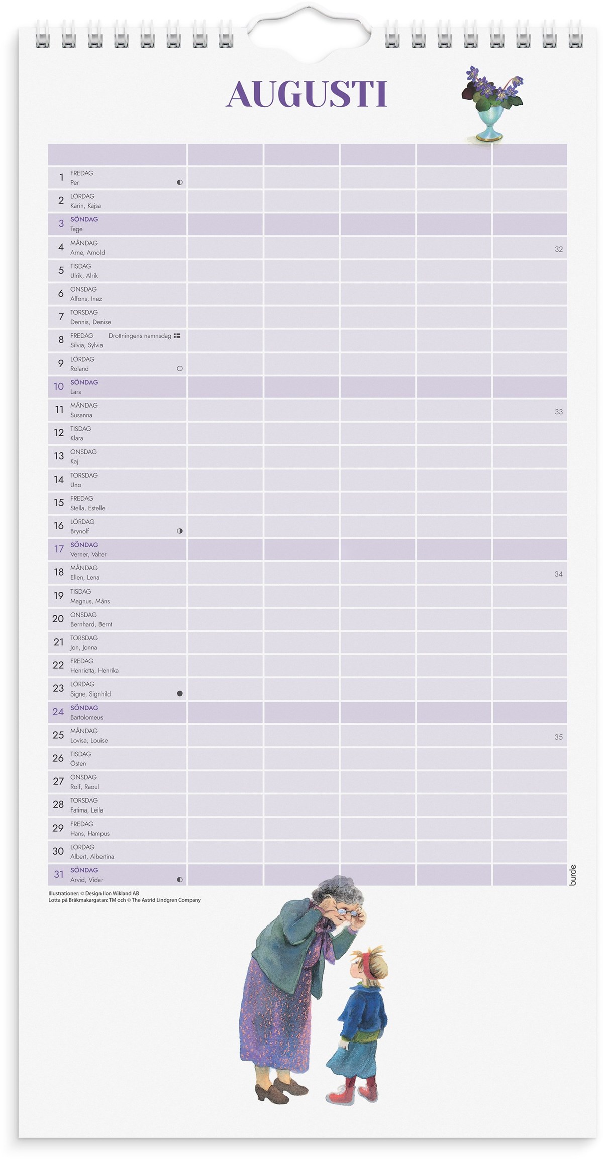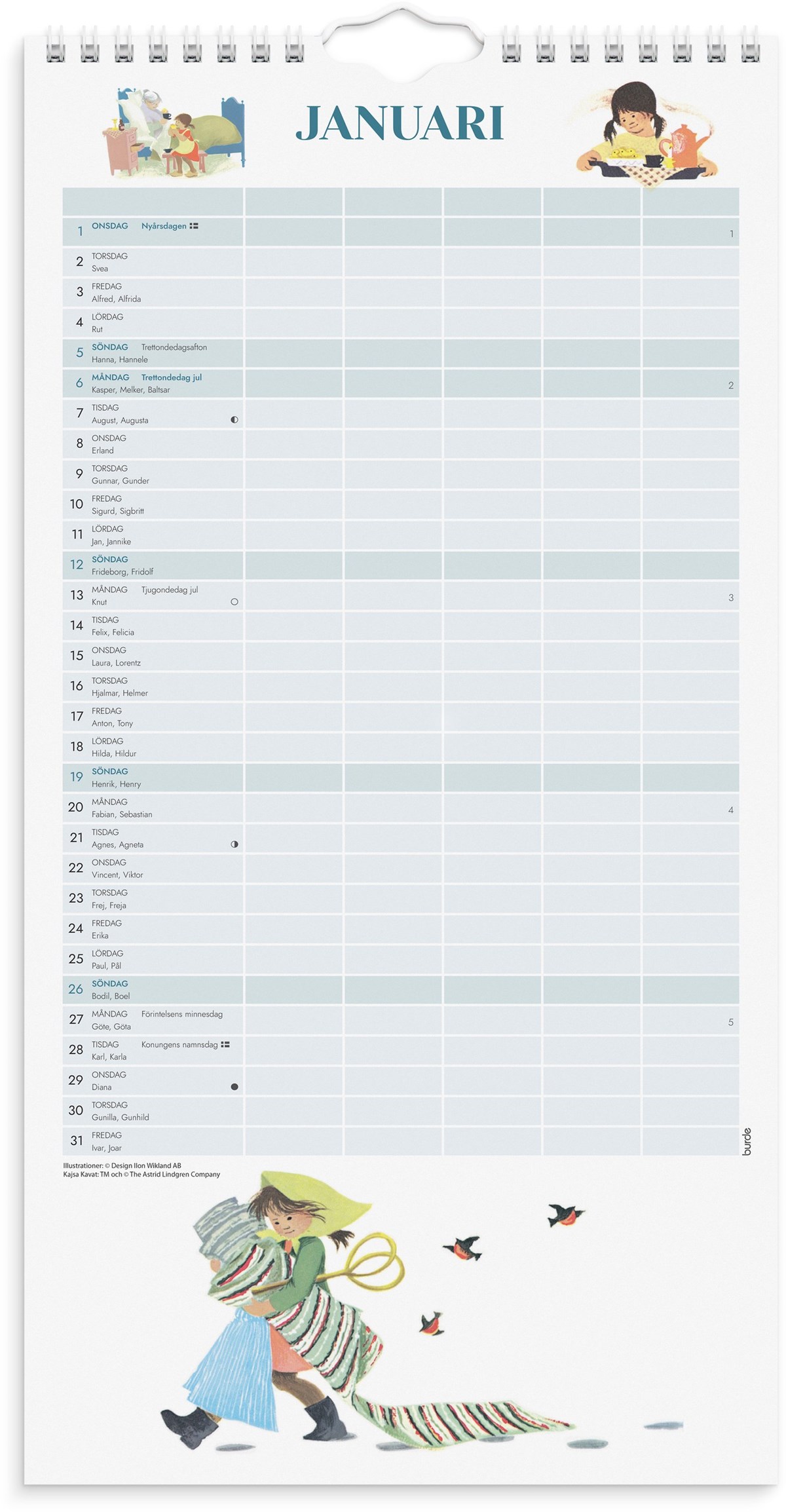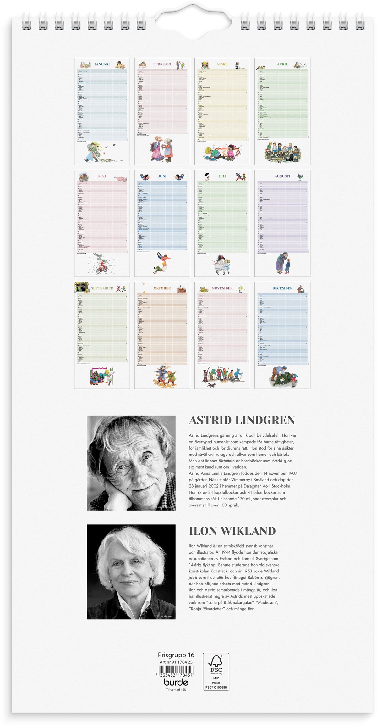 En väggkalender med fem kolumner för att lättare kunna planera och organisera ditt livspussel, du kan själv skapa kalenders funktion utifrån dina behov. Antingen dela in livet i aktiviteter, matlistor, födelsedagar eller dela in den utifrån familjemedlemmarna i hemmet. Vad om passar bäst i just ert hem. Kalenderns design visar illustrationer gjorda av Ilon Wikland över sagofigurer som har skapats och berättats av Astrid Lindgren.