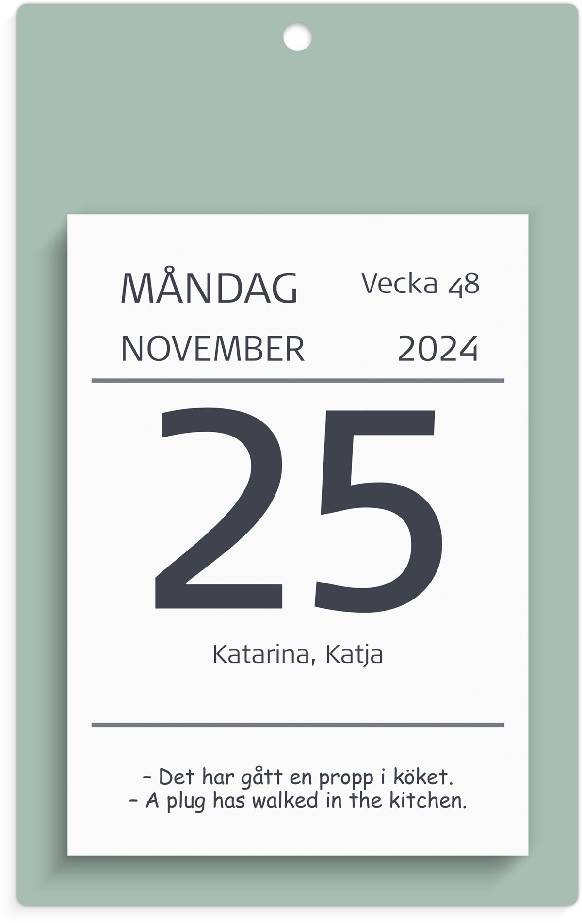 Följ året genom att riva av blad efter blad. Kalendern har ett väggplån som bakstycke och ett dagblock med stora siffror. Dagblocket har en vardag per blad och lördag och söndag på samma blad och är limbundet med klammerbaksida.