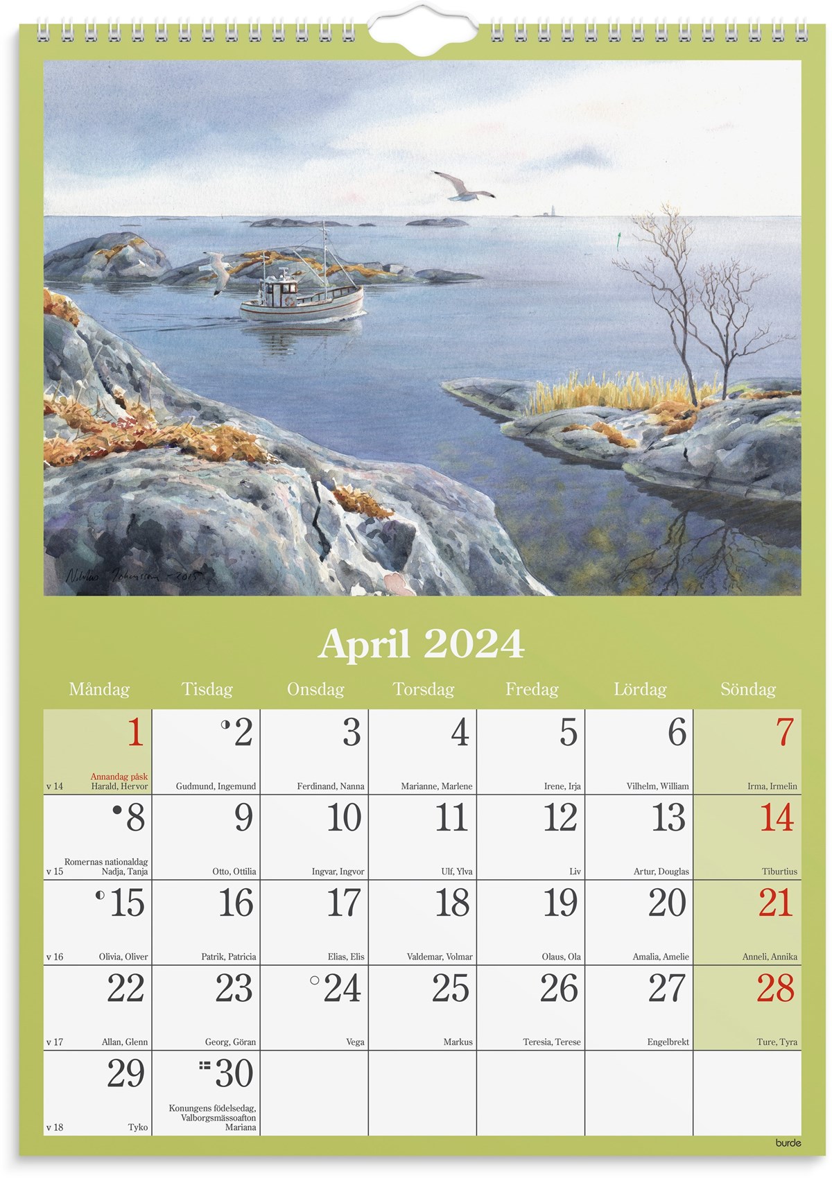 Väggkalender 2024 från Burde. Format: A3. Layout: Månad/Blad. Kalendarium: 2024-01-01 - 2024-12-31. Spiralbunden. Antal sidor: 12. Miljöinformation: FSC.