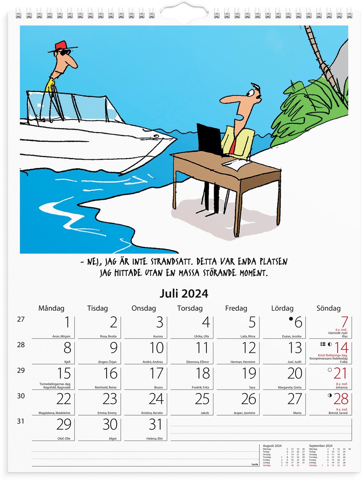 Väggkalender 2024 från Burde. Format: 295x390 mm. Layout: Månad/Blad. Kalendarium: 2024-01-01 - 2024-12-31. Spiralbunden. Antal sidor: 12. Miljöinformation: FSC.