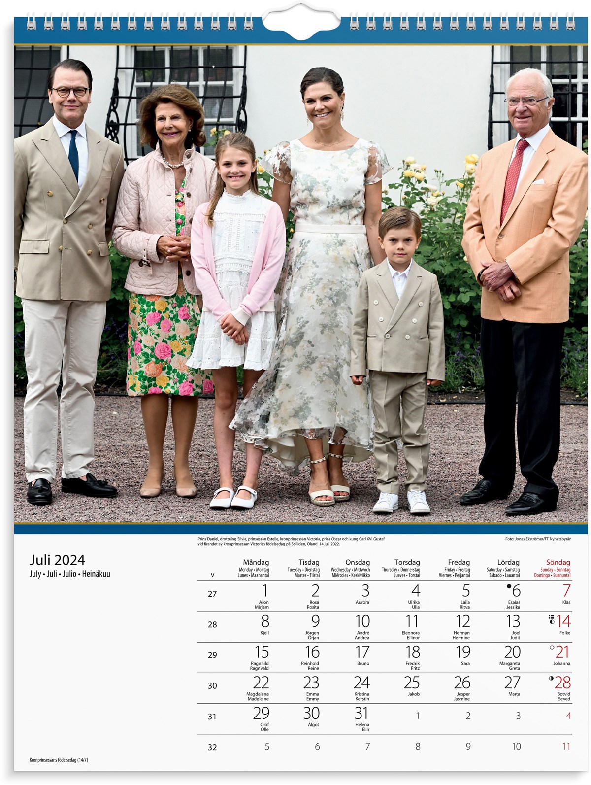 Bilder på svenska kungafamiljen, den är femspråkig (svenska, engelska, tyska, spanska och finska) och har svenska namnsdagar.