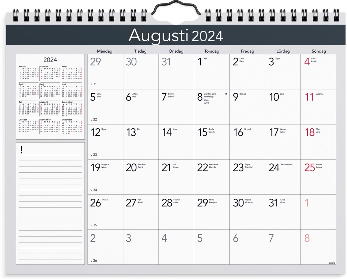 Väggkalender 2024 från Burde. Format: 350x270 mm. Layout: Månad/Blad. Kalendarium: 2024-01-01 - 2024-12-31. Spiralbunden. Innehåll: Plats för anteckningar, årsöversikt. Antal sidor: 12. Miljöinformation: FSC.