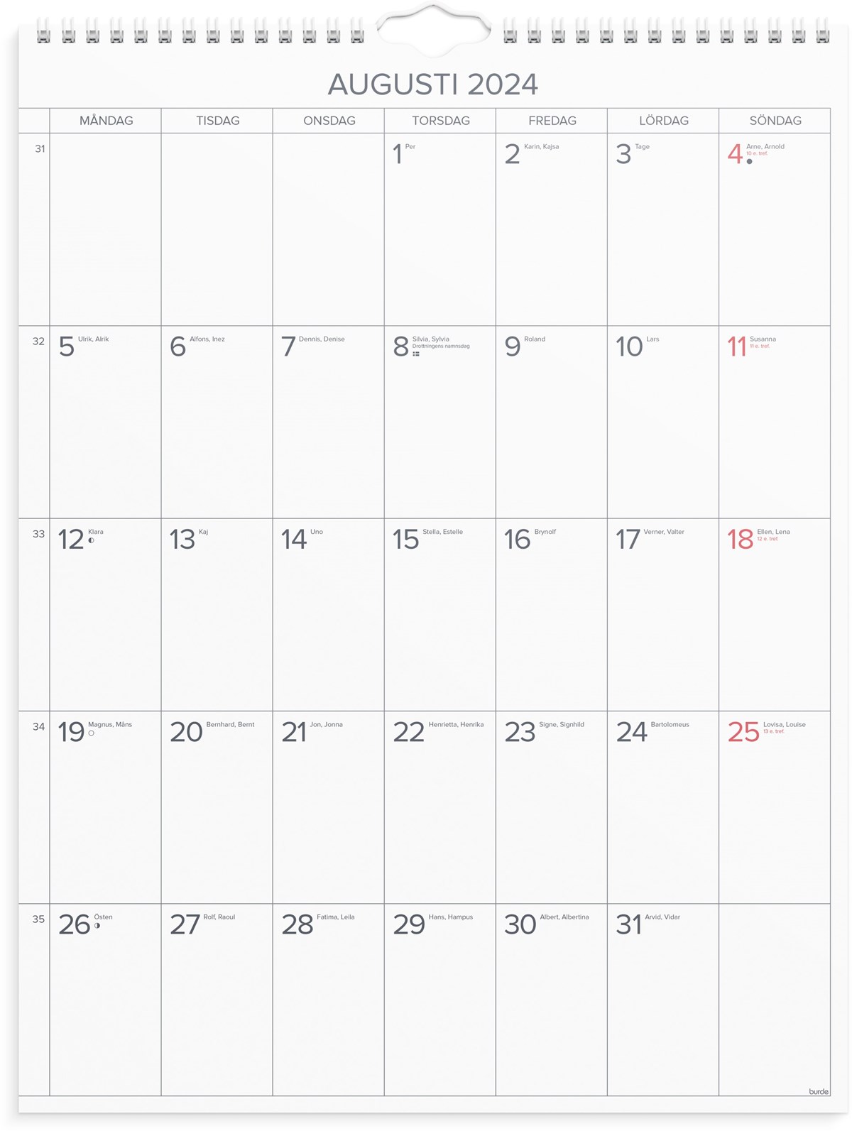 Väggkalender 2024 från Burde. Format: 295x390 mm. Layout: Månad/Blad. Kalendarium: 2024-01-01 - 2024-12-31. Spiralbunden. Innehåll: Årsöversikt. Antal sidor: 12. Miljöinformation: FSC.