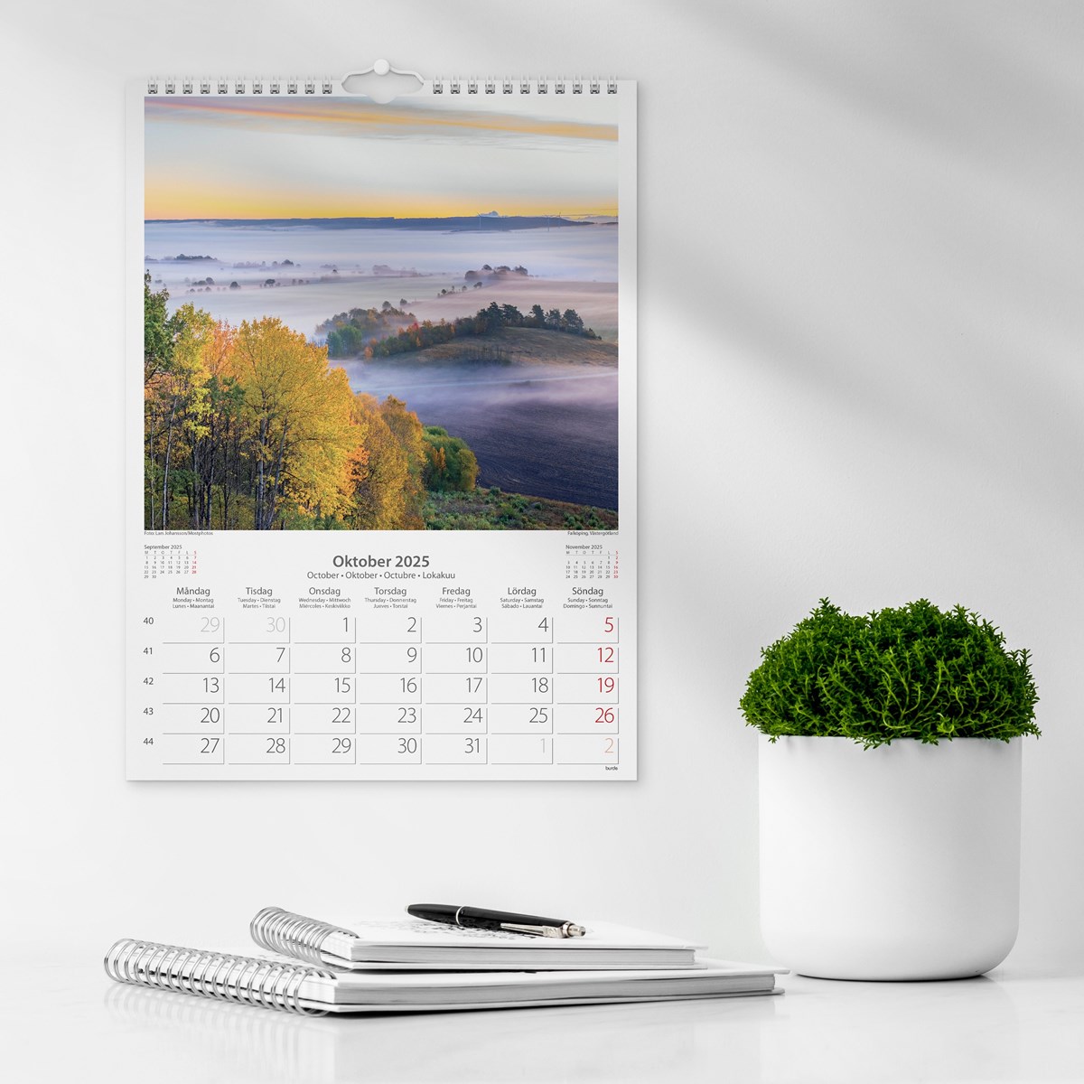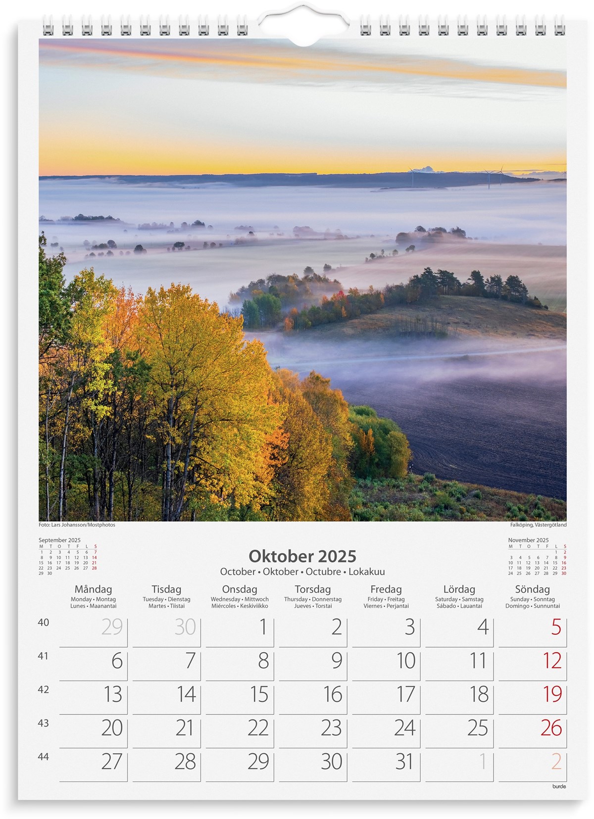 Väggkalender med tolv bilder från Sverige och svensk natur, den är femspråkig (svenska, engelska, tyska, spanska och finska).