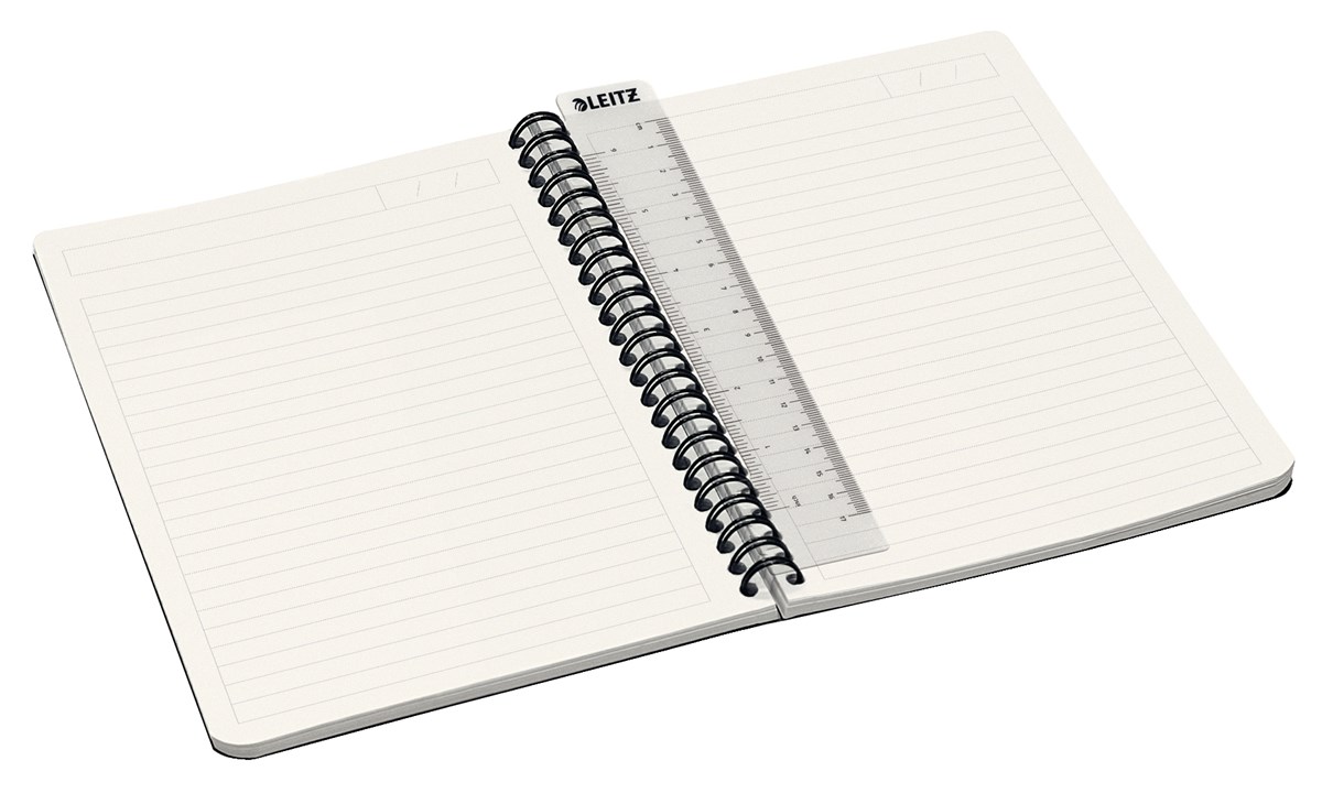 Spiralbundet block med omslag i tålig PP. 90 g papper med hög opacitet och med en speciell yta som ger en bra skrivyta utan kladd. Inramad linjering med titel och datumlinje i ovankant för bättre organisering av dina anteckningar. Löstagbar linjal som även kan användas som bokmärke. 90 linjerade blad. Ohålat. A5-format.