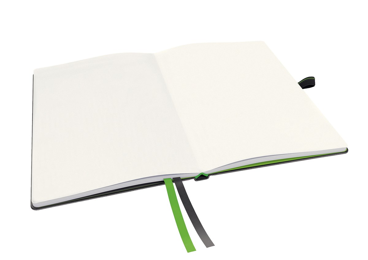 Inbunden anteckningsbok med innovativa funktioner. Attraktivt läderutseende med skön känsla. 80 g elfenbensfärgat papper av hög kvalitet. Två tygband som hjälper dig att hitta och öppna viktiga sidor snabbt. De sista åtta sidorna är perforerade med tre perforeringar per sida för enkel delning i mindre noteringar. Två buntar med 10 st självhäftande märkflikar medföljer för markering av viktig information. Gummibandsförslutning och pennhållare. Ficka på omslagets främre insida och en expanderbar ficka på insida bak. Linjerat papper. A5-format.