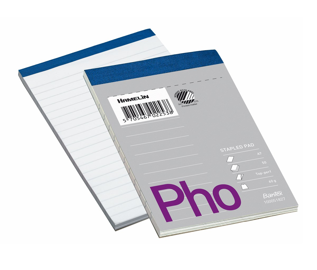 Häftat i överkant och försett med blå textiltejp. Pärmomslag av kartong. Mikroperforerat i överkant. Linjerat. A7-format. 60 g papper. 50 blad/block. 10 st/förp.
