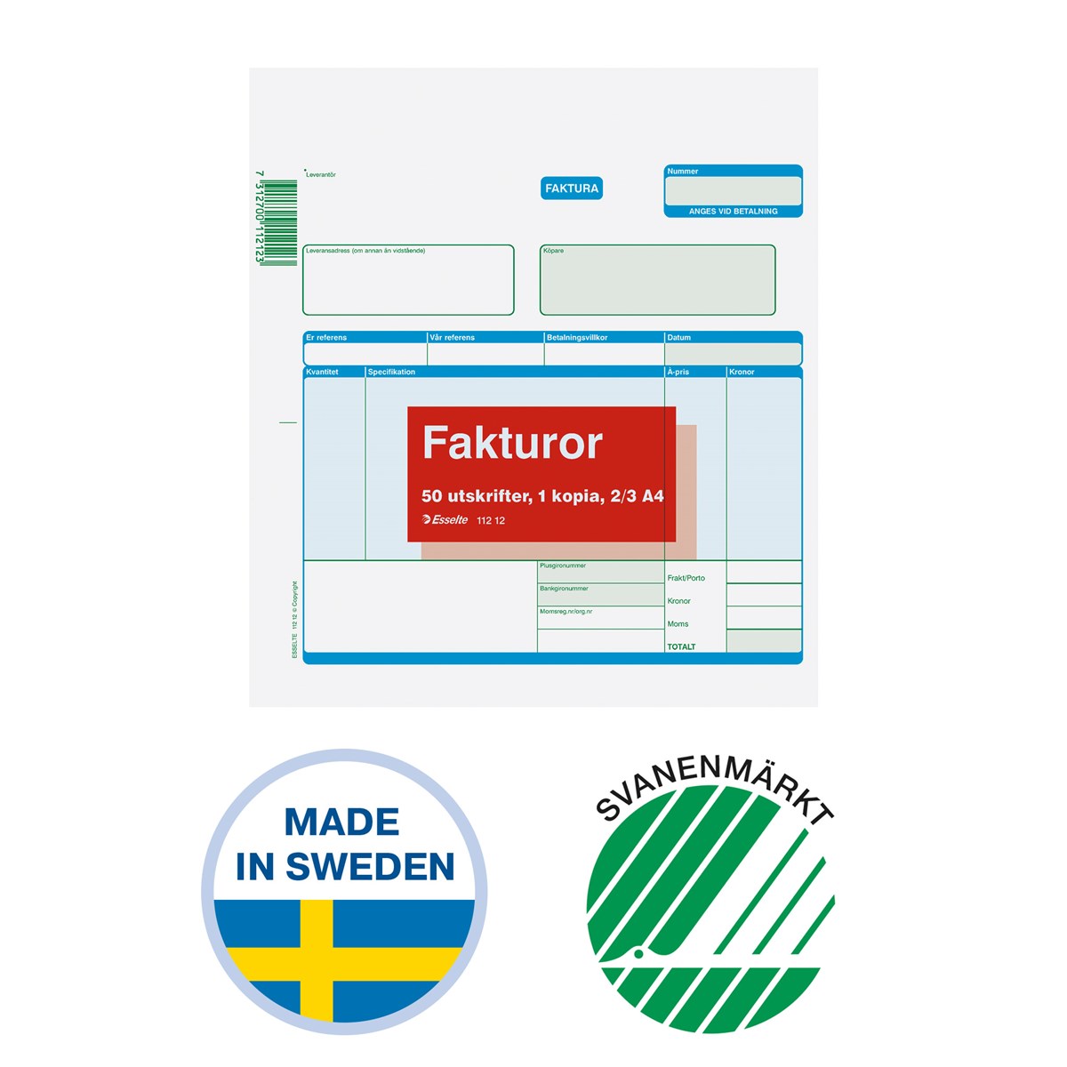 Svensktillverkade fakturor, 2/3 A4. Tillverkade i ISO-certifierat tryckeri i skånska Göingebygden. Råvaror köps in från pappersbruk i Sölvesborg, i närområde till fabriken. Svanenmärkta, licensnummer 3041 0461. Onumrerade fakturor med en (1) kopia. Maskinkarbon. 2 x 50 blad.