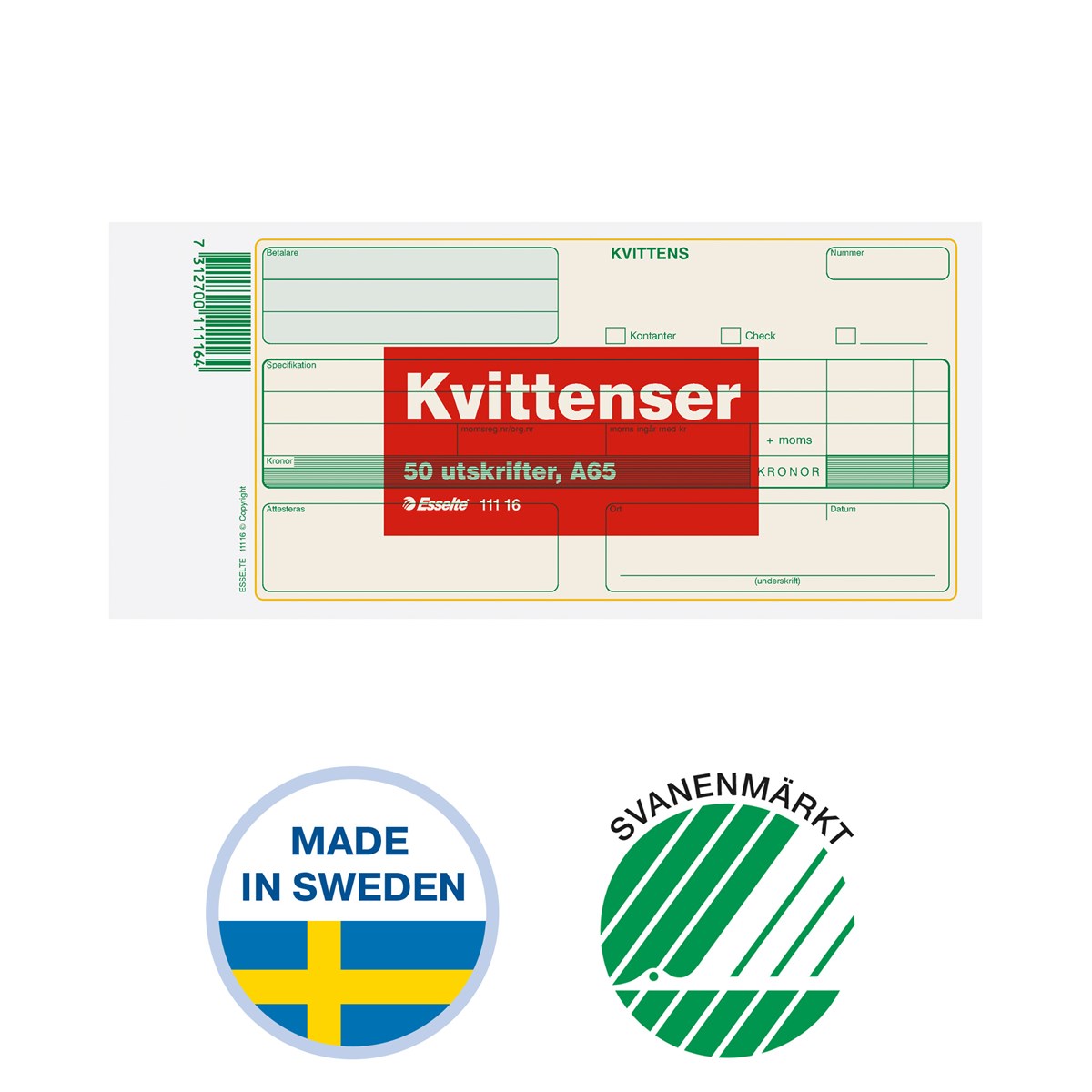 Svensktillverkade kvittensblanketter. Tillverkade i ISO-certifierat tryckeri i skånska Göingebygden. Råvaror köps in från pappersbruk i Sölvesborg, i närområde till fabriken. Svanenmärkta, licensnummer 3041 0461. Onumrerade kvittenser utan kopia, 50 blad.