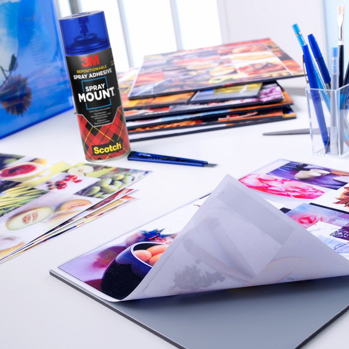 3M™ Scotch® SprayMount™ Häftämne ger utmärkt vidhäftning direkt men tillåter även att det som limmas att lyftas och flyttas under en kort stund. 3M™ Scotch® SprayMount™ är idealiskt för s.k. paste-up och konstverk samt för att fästa och montera de vanligaste materialen. Det kontrollerade sprutmönstret minskar häftämnesdimman avsevärt. Det ger en transparent och permanent vidhäftning och är säker för färgfoton, illustrationer, kartor och mycket mer. Det är syrafritt och fotosäkert. Idealiskt för presentationer, skapande av modeller, fotosamlingar, utställningar, skolprojekt, grafisk design och mycket mer. 400 ml.