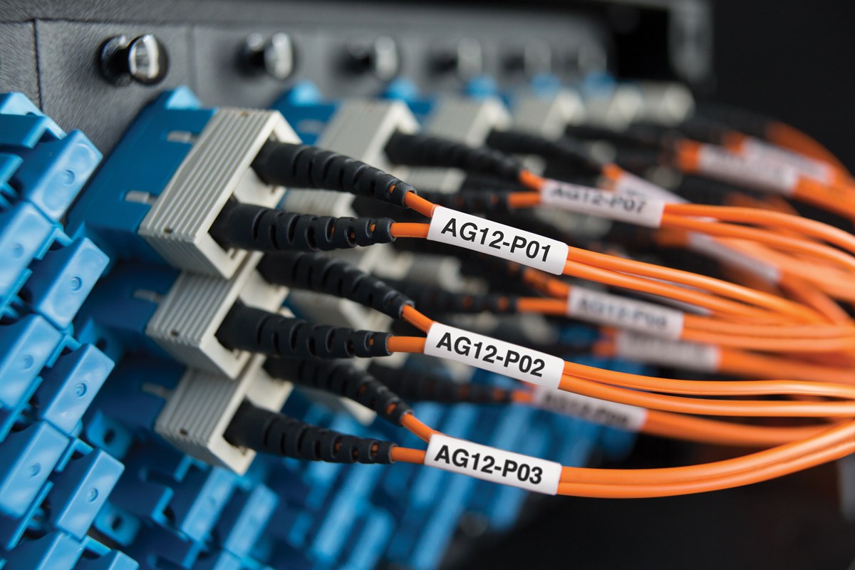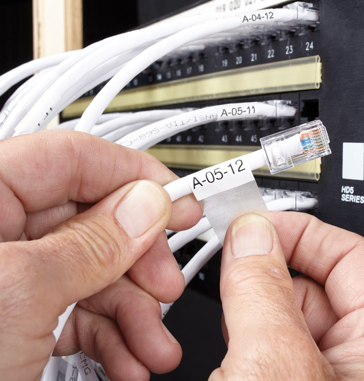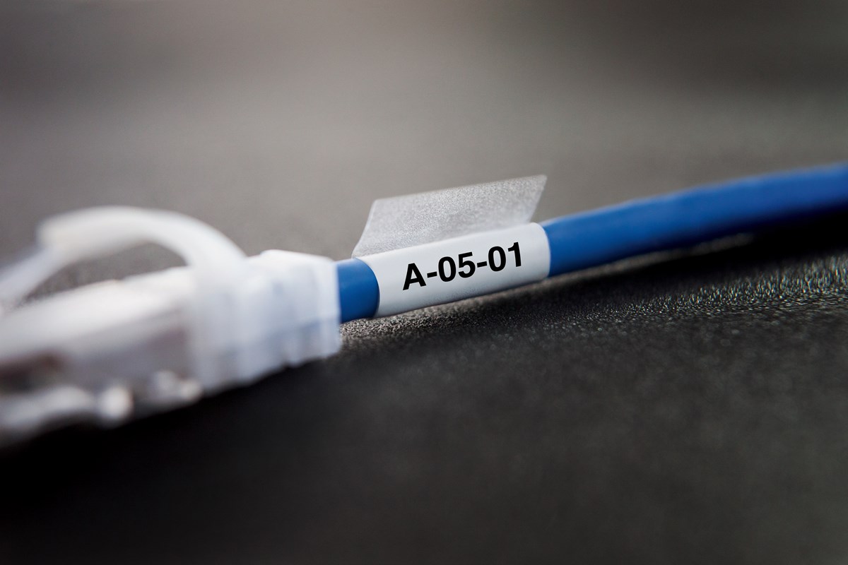 Etikett med med laminerat hölje. Svart text/vit tejp.