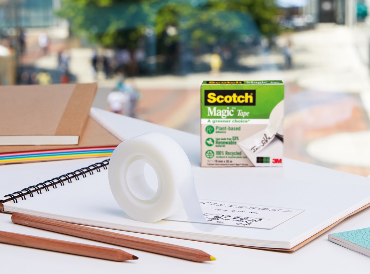 Av 53 % förnybart material, växtbaserat häftämne, kartong av 100 % återvunnen wellpapp och kärna i återvunnen plast Transparent efter applicering på de flesta papperstyper Permanent häftämne ger varaktig häftförmåga Det går att skriva på tejpen