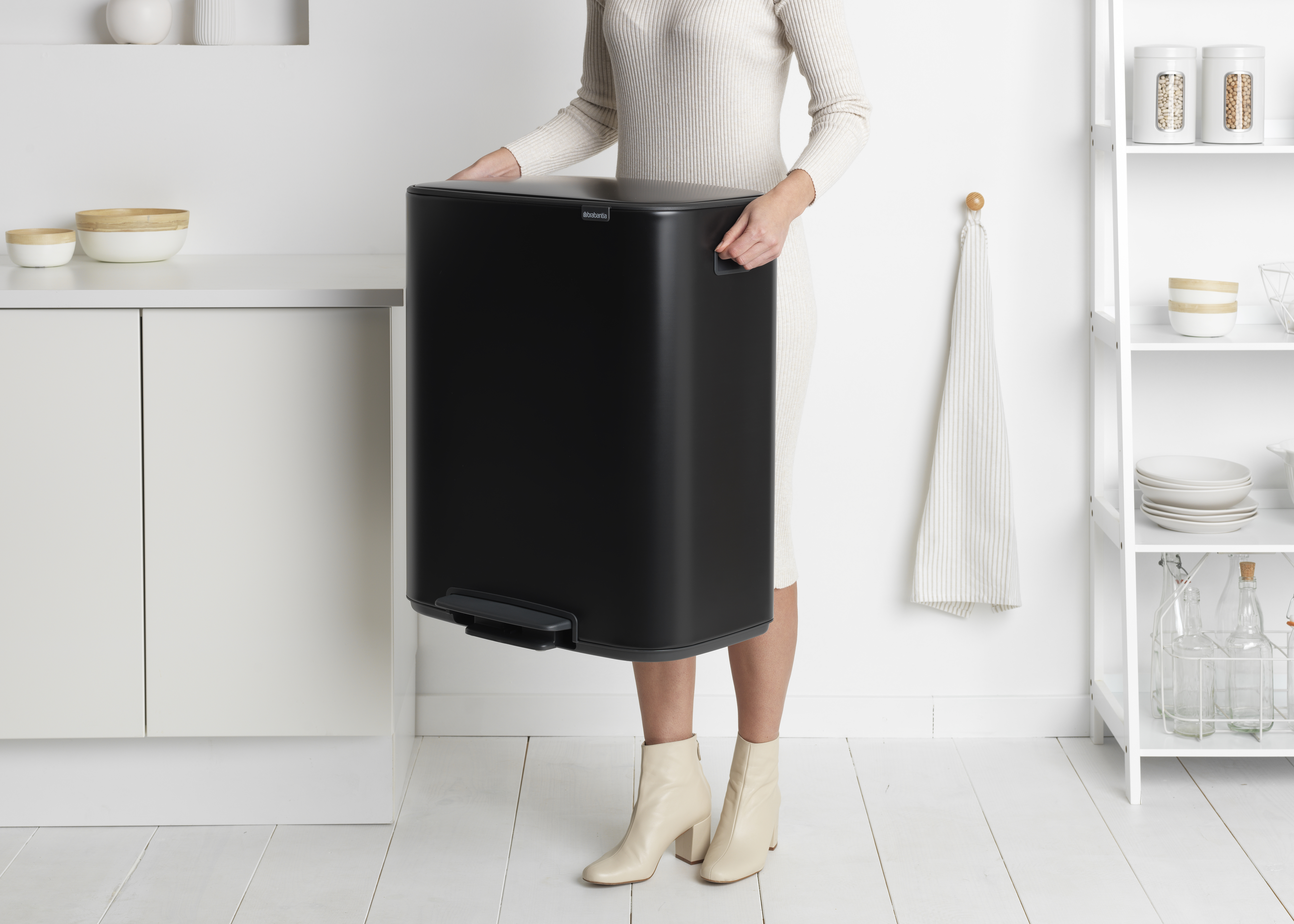 Snygg pedalhink med kapacitet på hela 60 liter. Mjukstängande lock. Integrerade handtag gör den lätt att flytta. Urtagbar plastinnerhink. Mått B x D x H: 54,1 x 36,3 x 65,2 cm. Avfallspåse PerfectFit storlek M. 10 års garanti.