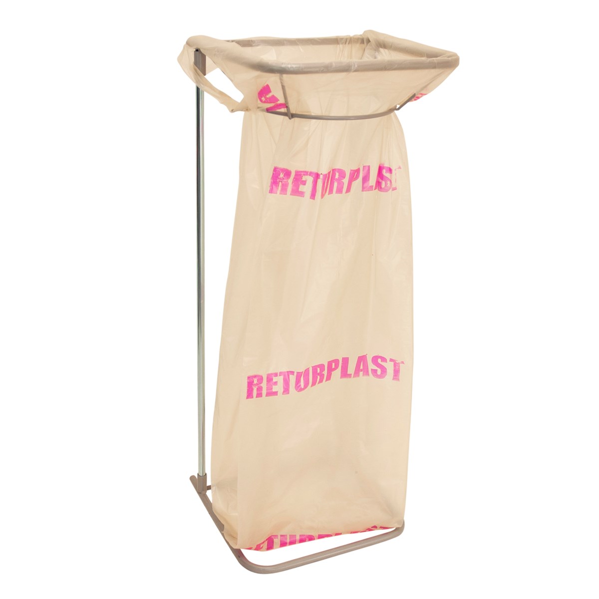 Returplastställ Ragnar är en säckhållare för returplastsäckar, 240 liter. Ringen i tratten gör att plasten håller sig i säcken.