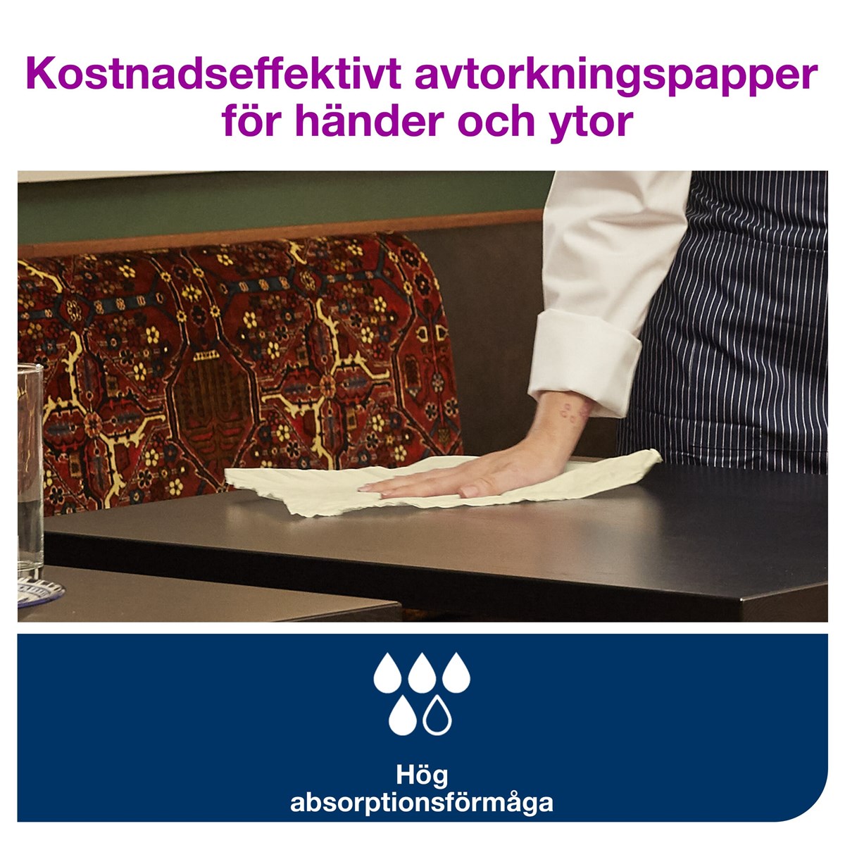 Kostnadseffektivt papper för enklare avtorkning av ytor och händer Hög absorptionsförmåga för att kunna torka upp spill Lägre förbrukning tack vare systemet med arkvis utmatning SmartCore® borttagbar hylsa för effektivare påfyllning