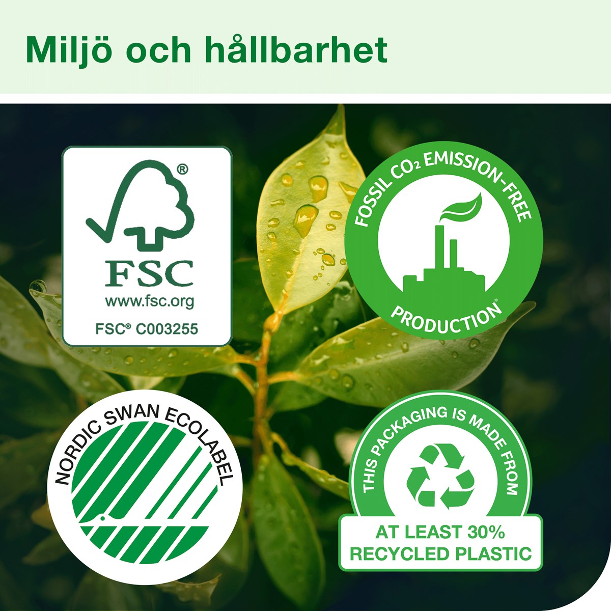 Mjukt och ljust papper för ett bestående intryck För toalettutrymmen med låg besöksfrekvens Mönsterpräglad premiumdesign Tork Easy Handling-förpackning är enkel att bära och göra sig av med