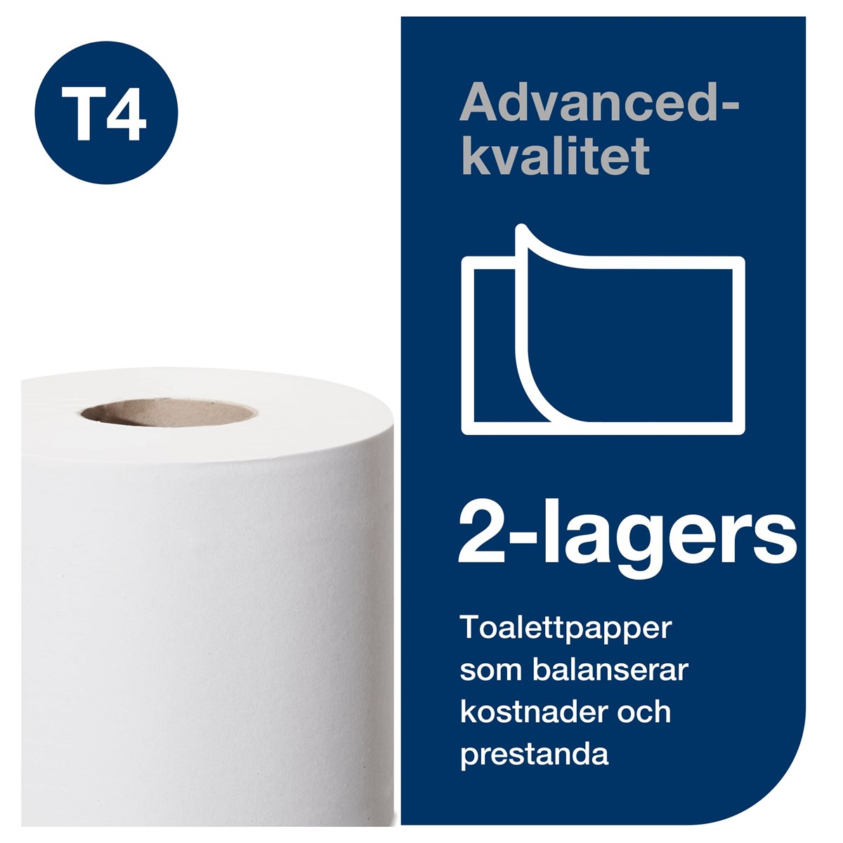 Balanserar kostnad och prestanda. Lättanvänt perforerat papper Stora, starka ark Tork Easy Handling förpackning som är enkel att bära och göra sig av med Passar för toalettutrymmen med låg besöksfrekvens